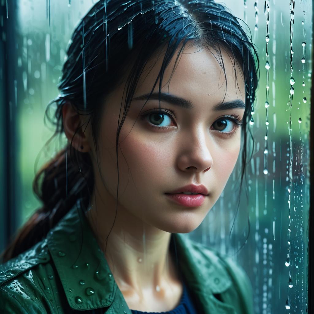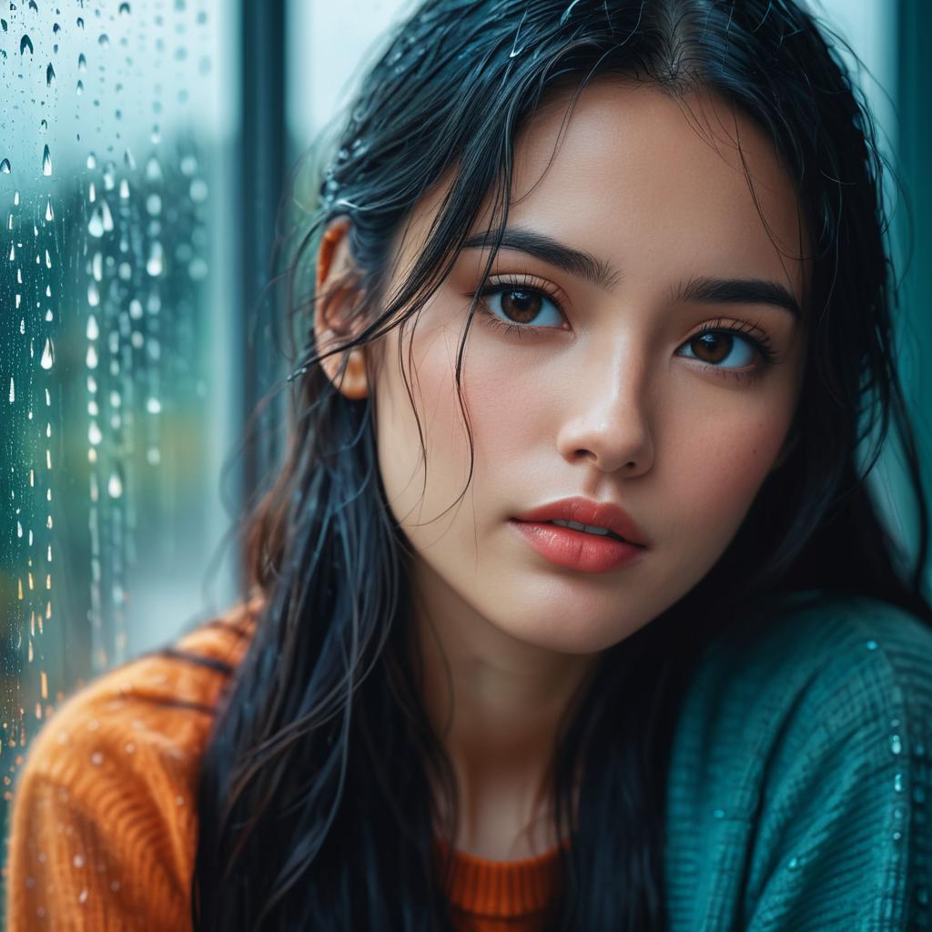 A young woman with long dark hair leaning on a rainy window, soft natural light illuminating her delicate features, melancholic expression, cinematic moody portrait, raindrops on the glass, teal and orange color contrast, shallow depth of field, emotional and introspective atmosphere