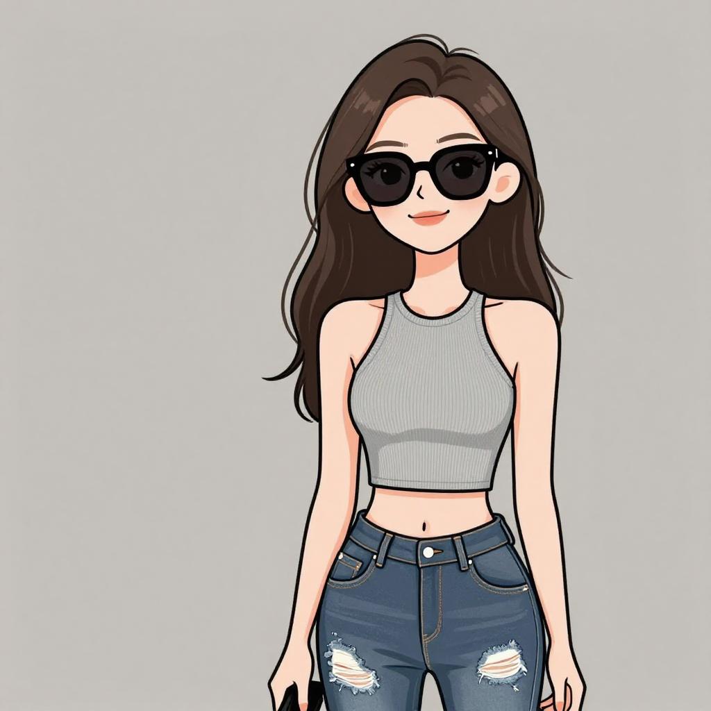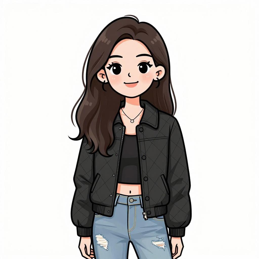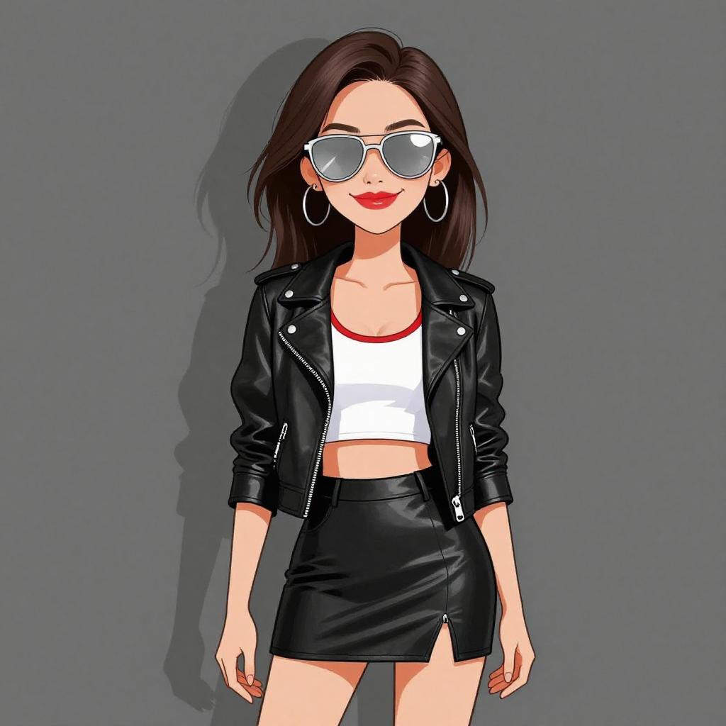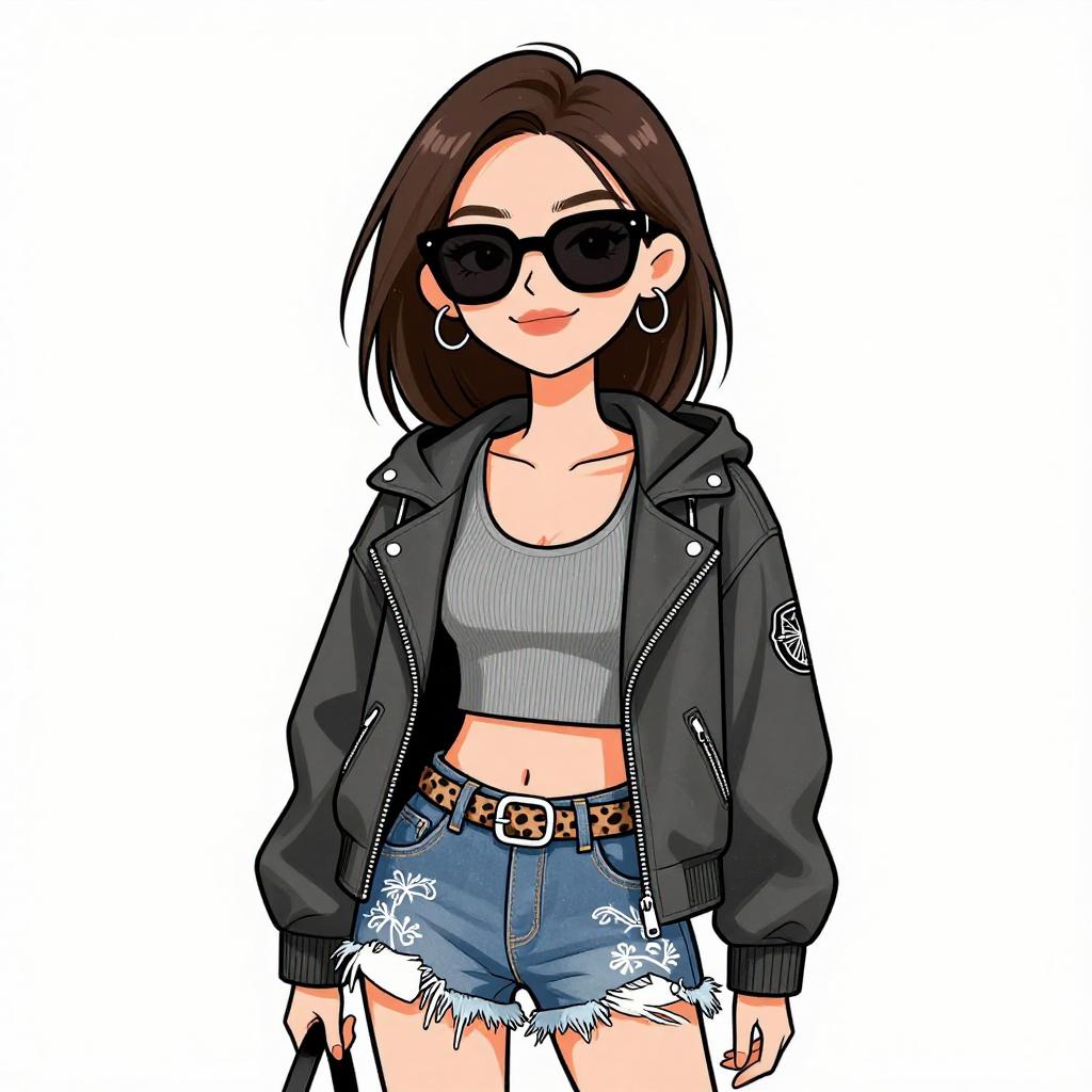 Woman with pretty face and pretty hair. smiling Woman, chic, black textured zip-up jacket with pointed collar and zipper pockets, paired with black faux leather shorts, oversized round sunglasses. --sref 1467