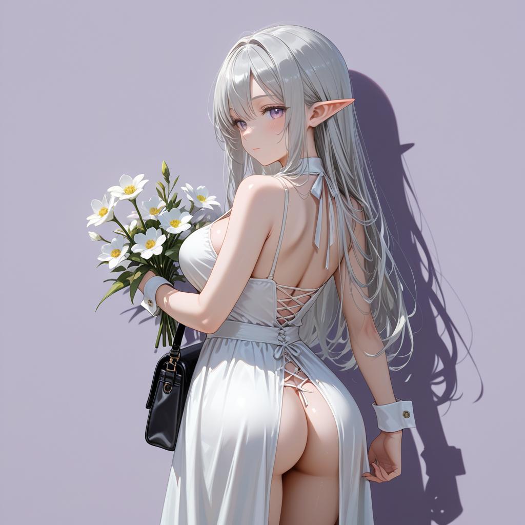 1girl, ass, back, bag, breasts, cowboy_shot, dress, elf, flower, grey_hair, holding_bag, holding_flower, large_breasts, long_hair, looking_at_viewer, looking_back, no_panties, parted_lips, pointy_ears, purple_eyes, simple_background, sleeveless_dress, solo, white_dress, white_flower, wrist_cuffs, detailed skin texture, detailed, volumetric shadow, volumetric lightning