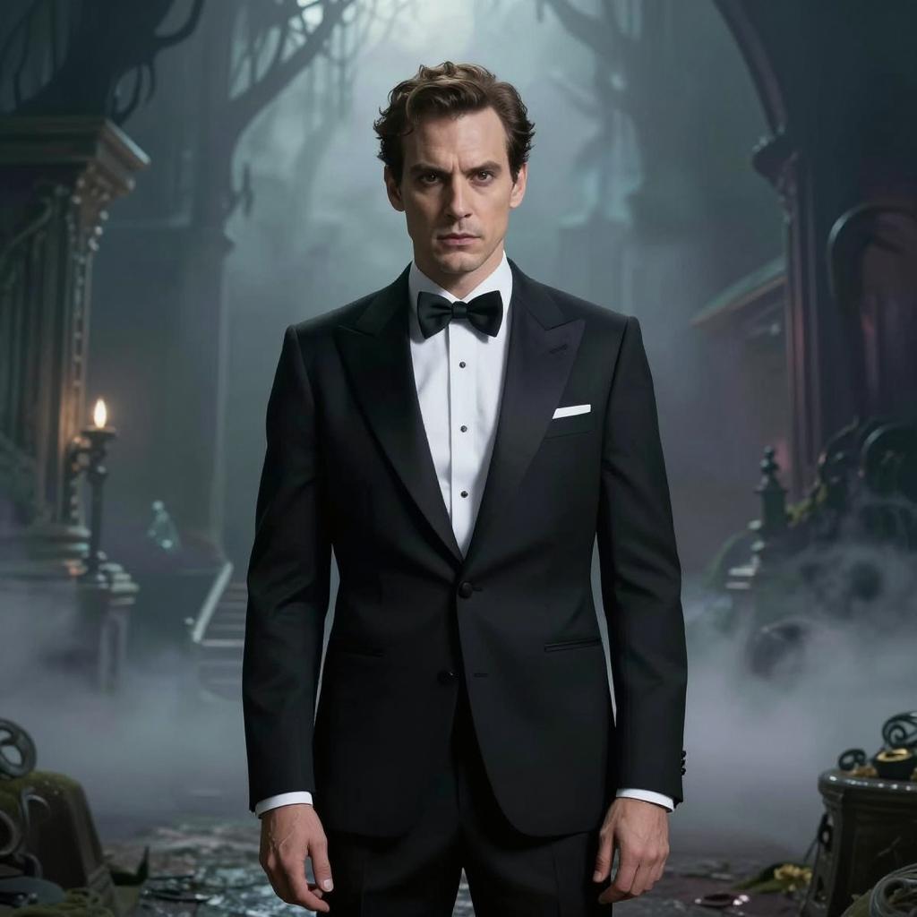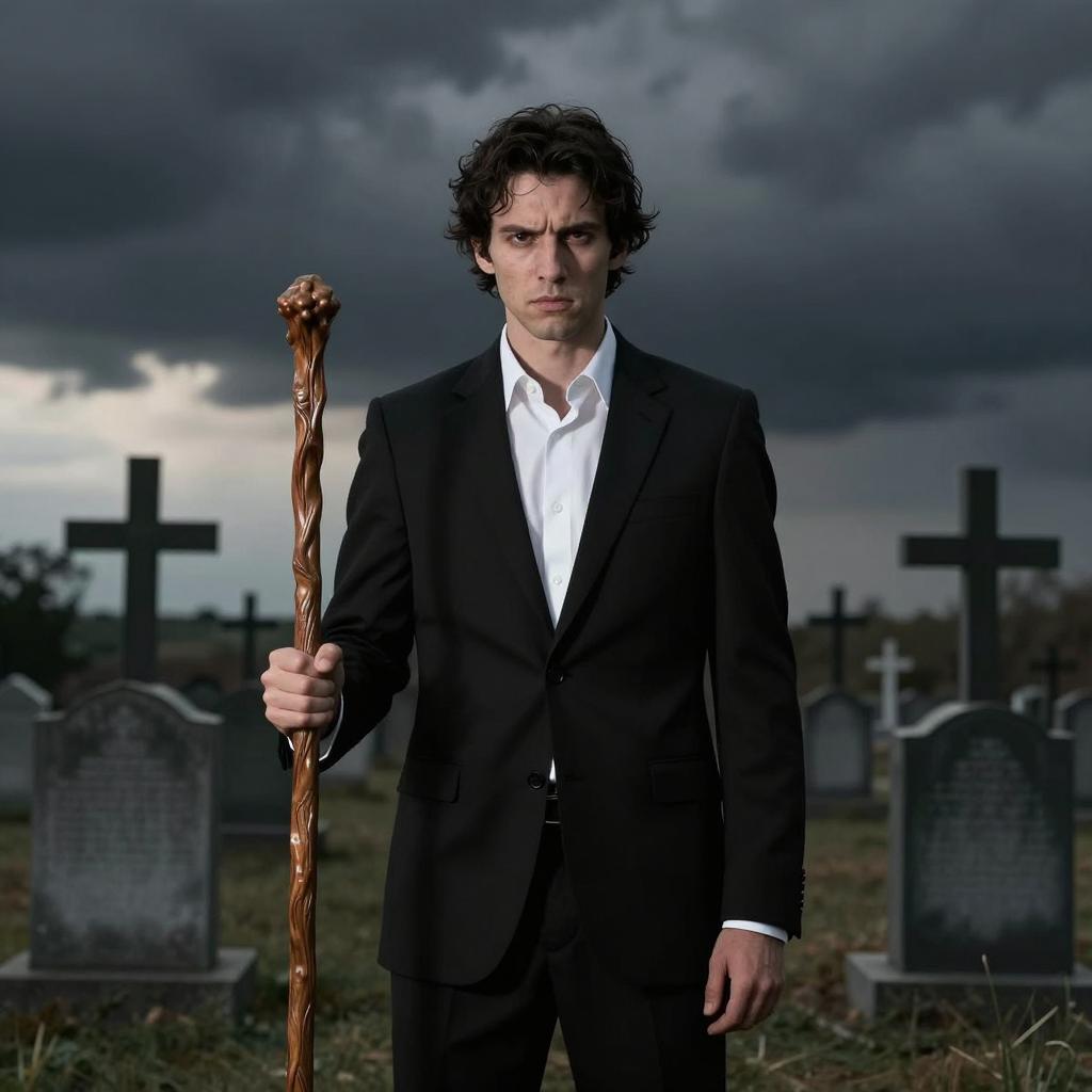 A bald man in a black robe stands in a dimly lit, ornately decorated hallway, hiding behind a door with his hand on the wall. His intense gaze faces the viewer. An old-fashioned lamp illuminates part of the wall. Background includes an open door and a window with blinds. The setting has dark wooden furniture and intricate wall designs.