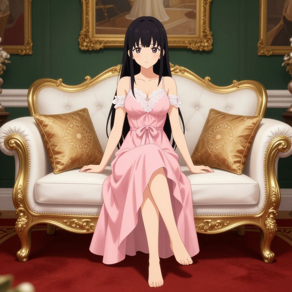 Illustration of an anime-style woman sitting barefoot on an elegant white and gold ornate couch with decorative cushions in a luxurious room. She wears a long pink dress with lace details and a ribbon tied around her waist. The setting features dark green walls, framed artwork, and rich red carpeting.