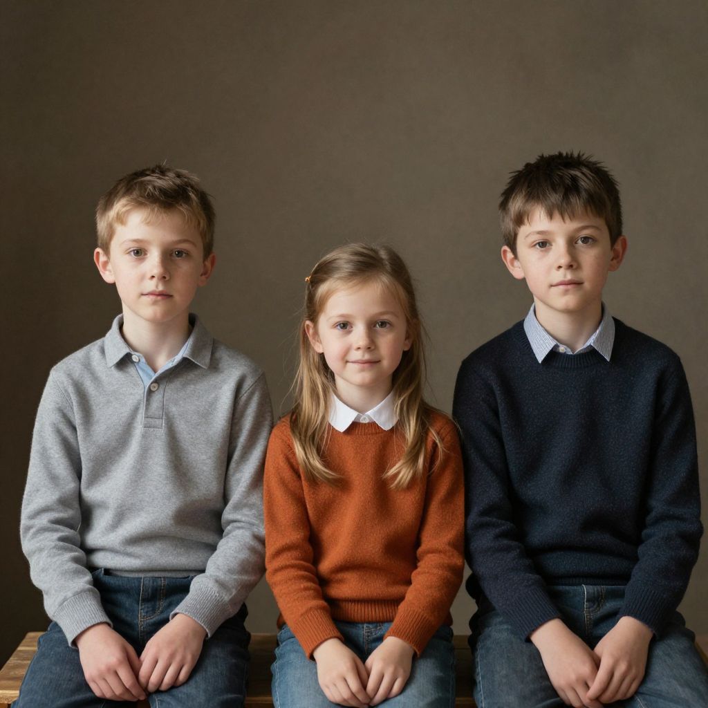 Photograph of three children, two boys and one girl, sitting against a dark background, wearing casual sweaters and collared shirts.
