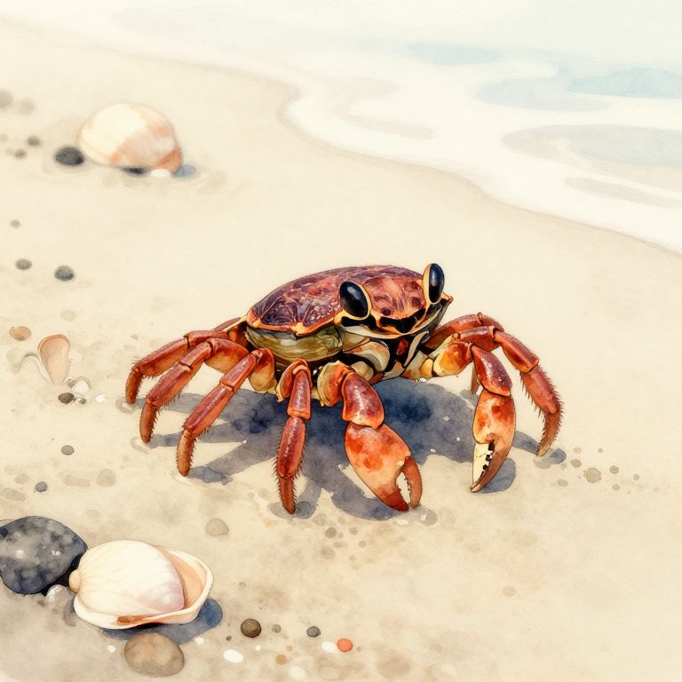 Ilustración detallada de un cangrejo caminando entre hojas marinas en aguas poco profundas, estilo acuarela digital combinada con toques de realismo, colores suaves y naturales, sensación tranquila y serena.