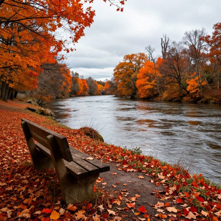 Riverbank in autumn with vibrant orange and red leaves scattered on the ground, tranquil flowing river under cloudy sky, weathered wooden bench facing water, distant birds flying low, cozy and nostalgic atmosphere in nature's embrace