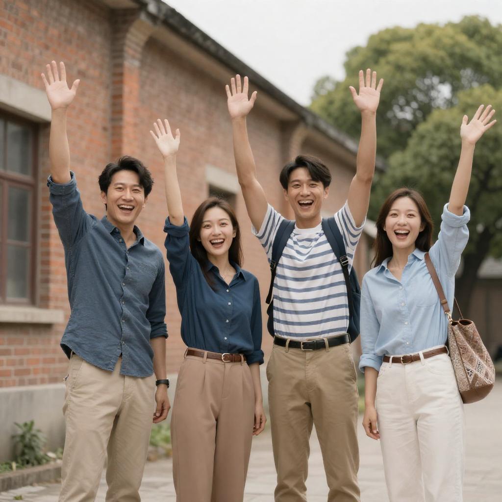 Photograph of four people standing outside a weathered brick building, raising their arms in excitement. Two men and two women, casual clothing, smiling. Man on left wears blue shirt, beige pants. Middle woman in blue shirt, tan pants. Man in center wears striped shirt, khaki pants, backpack. Woman on right wears light blue shirt, white pants, patterned bag. Overcast sky, trees in background.