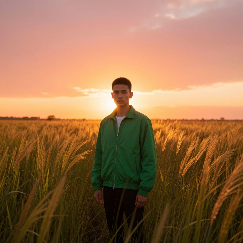 Photograph of a young man with short dark hair, wearing a green jacket and white shirt, standing in a golden wheat field at sunset with a vibrant