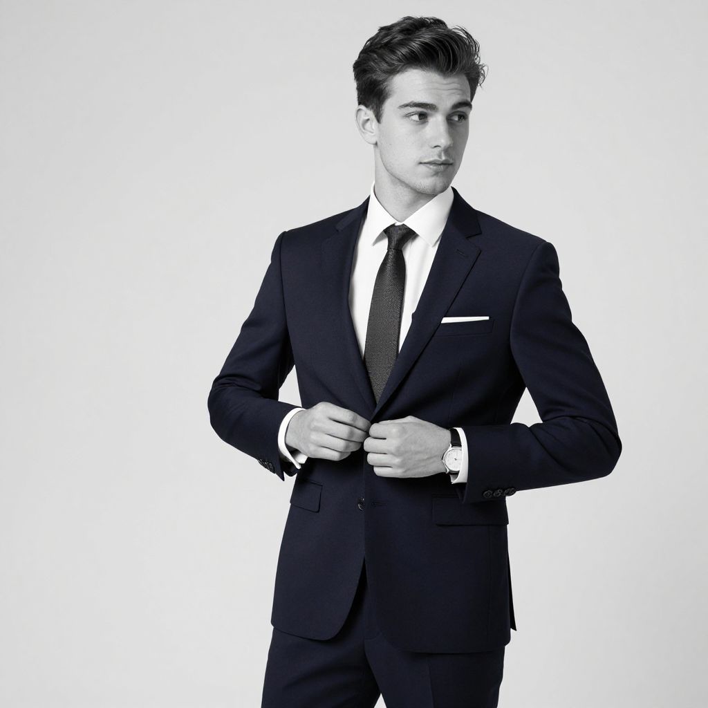 Monochrome black-and-white full-body studio portrait of a young Caucasian man with dark hair wearing a tailored navy blue suit, white dress shirt, and dark tie. The man stands confidently against a plain light background with a relaxed and approachable expression, showcasing sharp facial features and well-groomed hair. He is buttoning his suit jacket, dressed elegantly with a pocket square and wristwatch, radiating professionalism and style.