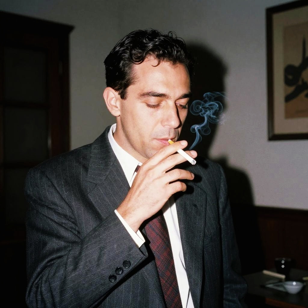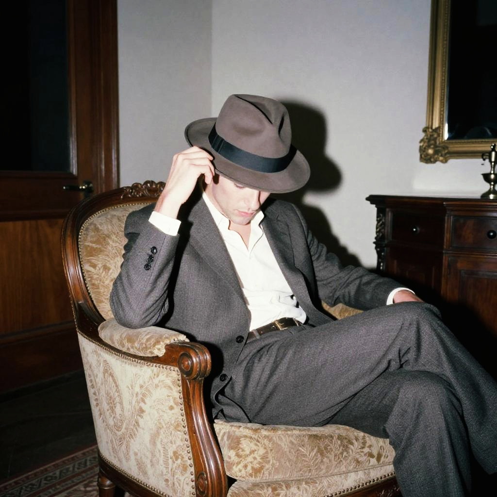 Realistic film photograph taken with direct flash with overexposure and hard shadows, the photograph shows a man with slicked-back hair tuning an old phonograph, vintage interior. Vibe is melancholic.