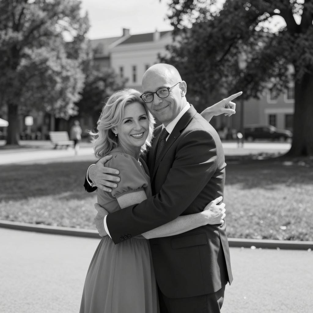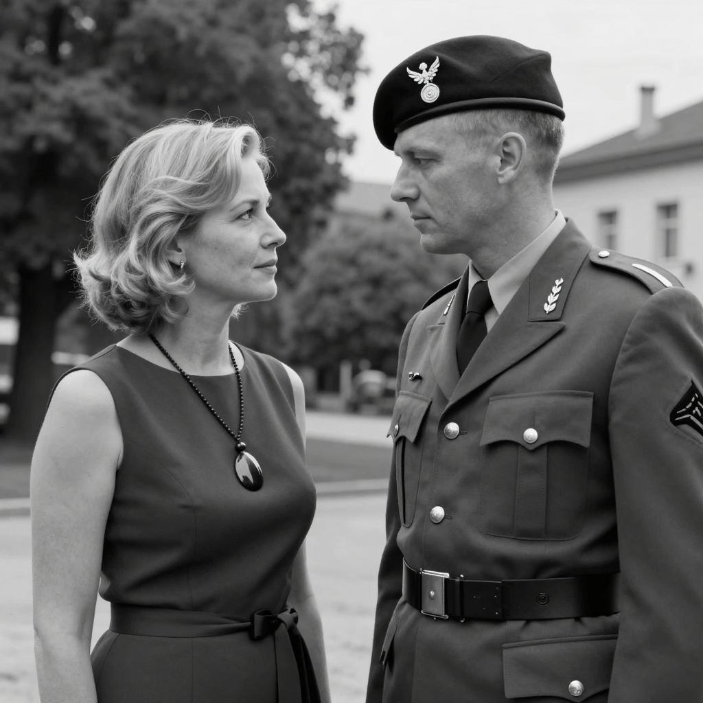 Black and white photograph of a man and woman standing close, facing each other. Man wears military uniform with dark beret, white shirt, and dark tie. Woman has short blonde hair, sleeveless dark dress, and large pendant necklace. Background includes trees and buildings. Both look at each other with serious expressions. Man on the right, woman on the left. Two people.