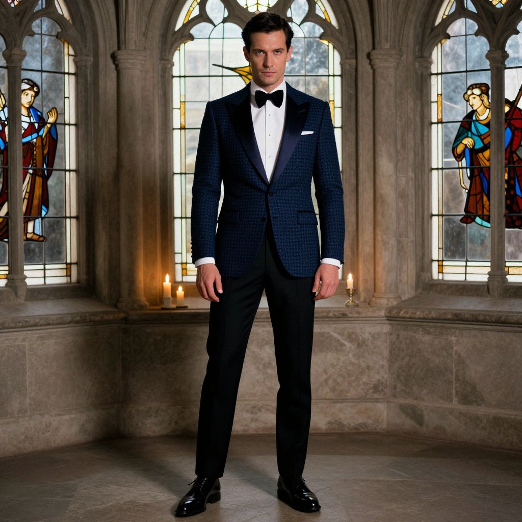 A man, midnight blue houndstooth dinner jacket, silk blend, white spread collar shirt, black velvet bow tie, fitted black trousers, sleek black derby shoes, gothic arches, stained glass windows, flickering candlelight, ib technicolor film stock, confident expression, poised demeanor. Man has masculine face and piercing eyes