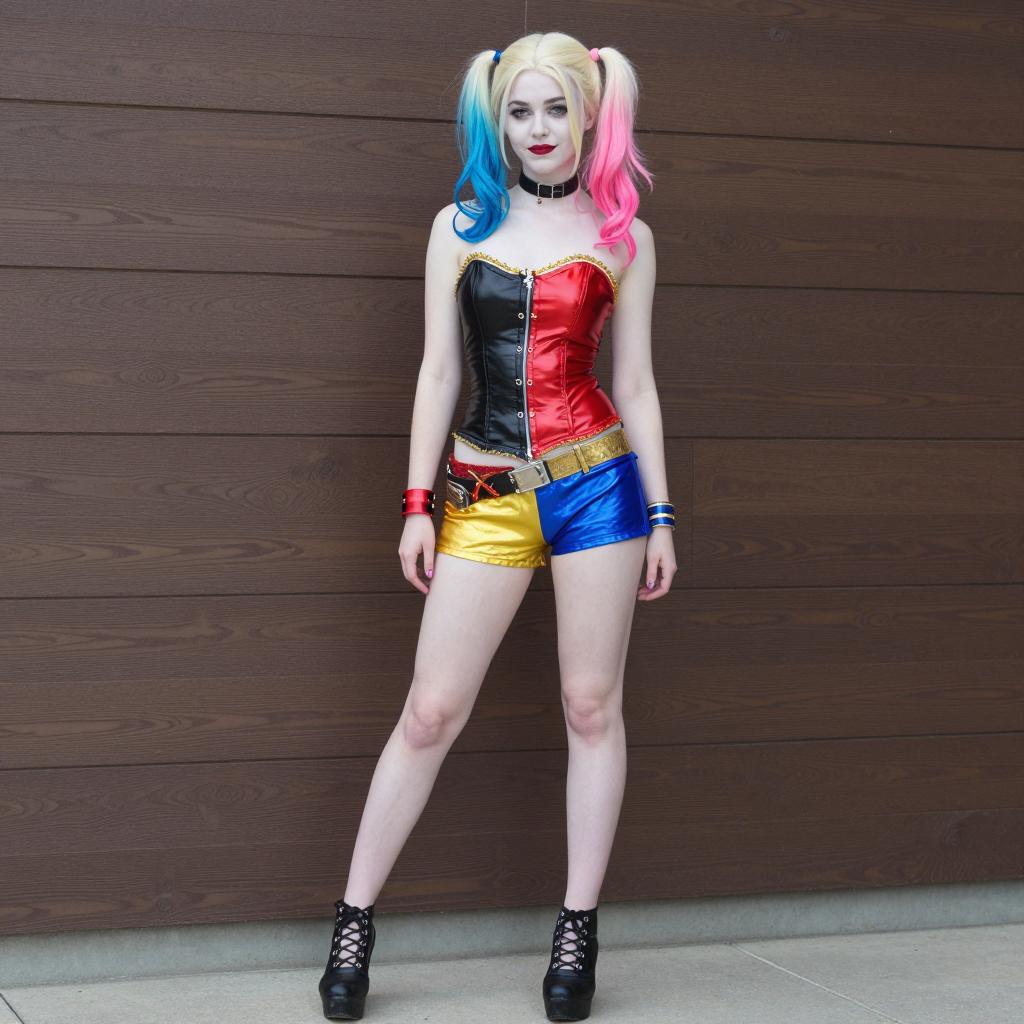 Male harley quinn costume, photograph of a young person, male, standing, facing right, wearing a red and white long-sleeve shirt with black and white paneling, red pants, hands in pockets, black face paint with white circles around eyes, blond hair in pigtails with blue and red tips, slight smile, grey background, casual pose, cosplay, Harleys Quinn, realistic style, bright lighting