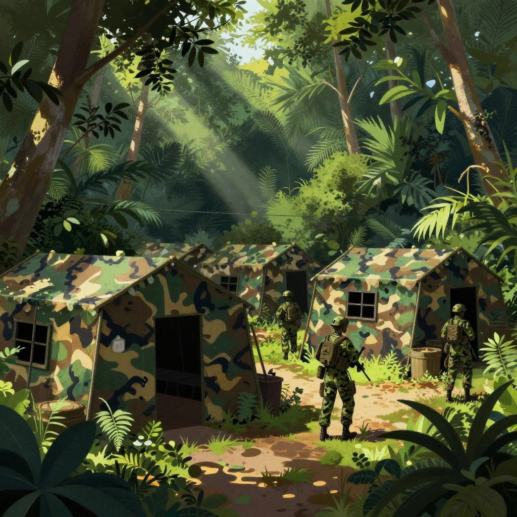 Military base art featuring a dense jungle camp with camouflaged structures, soldiers camouflaged in green gear, vibrant foliage around, shafts of sunlight piercing through dense trees, painted in a semi-realistic style focused on survival and stealth.