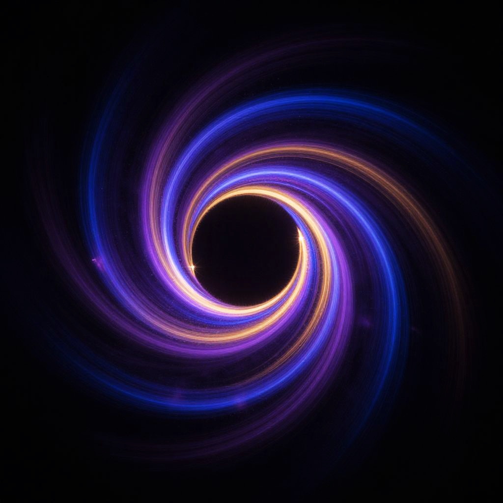 Abstract composition of lichter represented as vibrant light trails swirling through a dark void, blending colors of purple, blue, and gold, dynamic motion and glowing effects create an otherworldly, energetic, and futuristic ambiance with sharp details and contrasts.