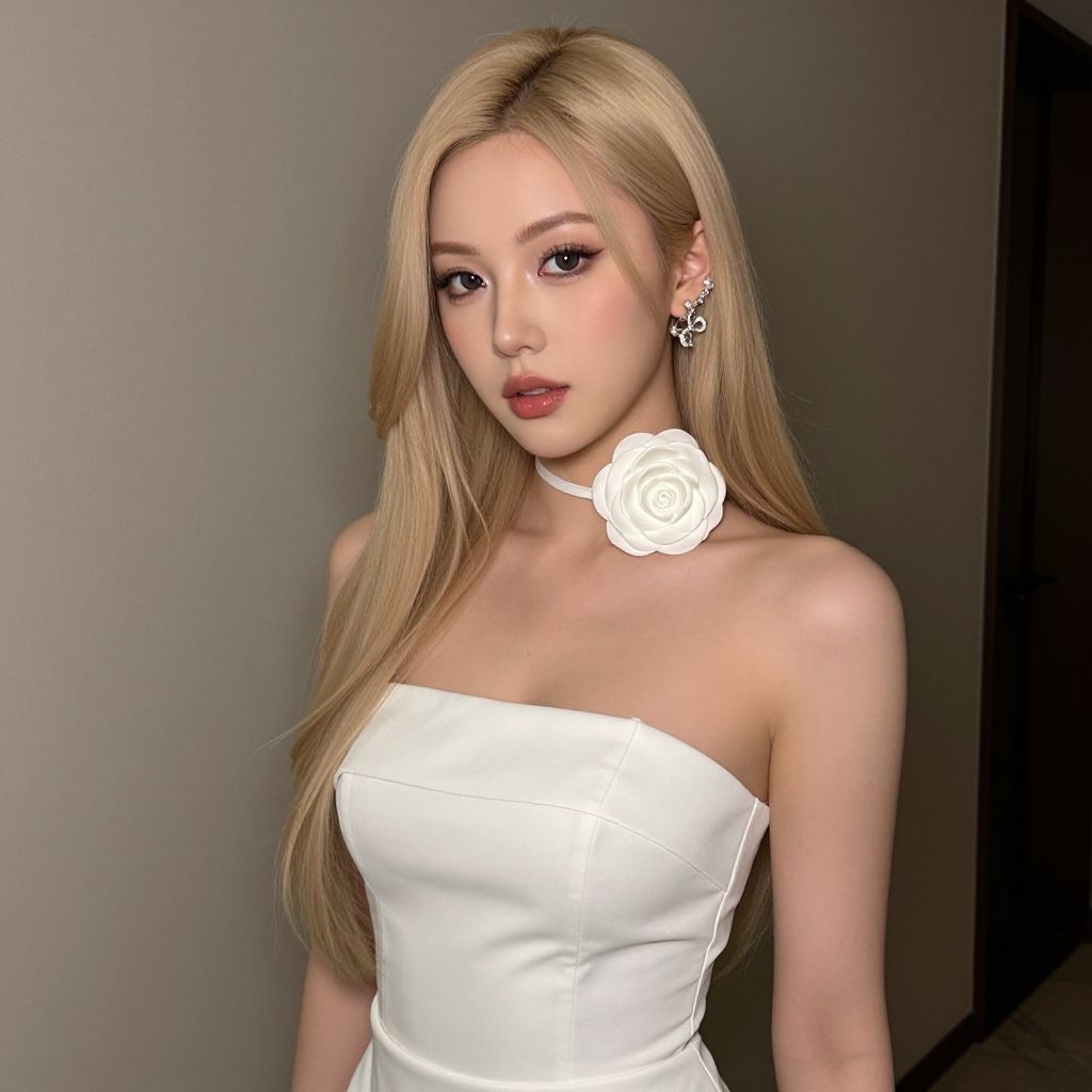 Birthday guest dress, 1girl, solo, dress, blonde hair, long hair, jewelry, earrings, white dress, flower