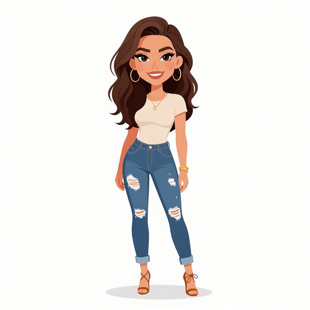 Woman with pretty face and pretty hair. smiling Woman, casual, fitted short-sleeved beige t-shirt, distressed blue jeans with torn details, cuffed at the ankle, strappy tan heels with lace-up detail, layered necklaces, bangle bracelets. --sref 1467