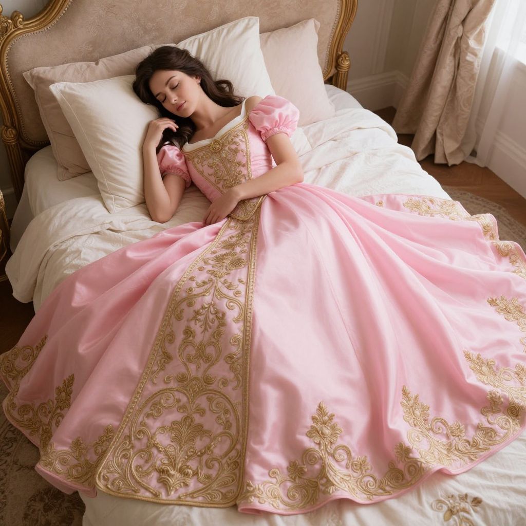 A woman elegantly sits on a vintage-inspired bed, adorned in a Sleeping Beauty gown crafted in high-definition digital art, featuring intricate gold embroidery and a flowing pink skirt that exudes a romantic, fairy-tale aesthetic.