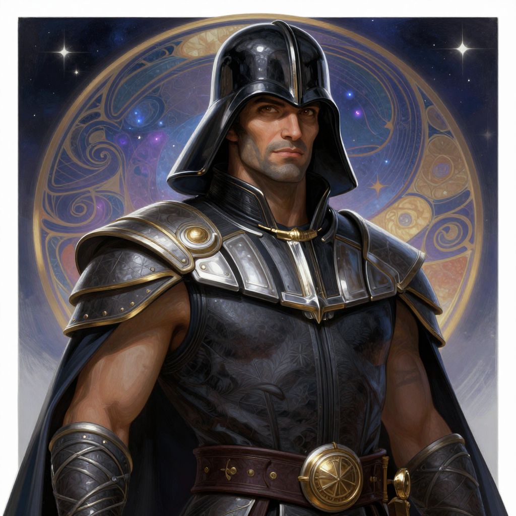 Digital illustration of a muscular, fair-skinned man in dark armor with a metallic helmet, standing against a celestial, circular pattern backdrop.