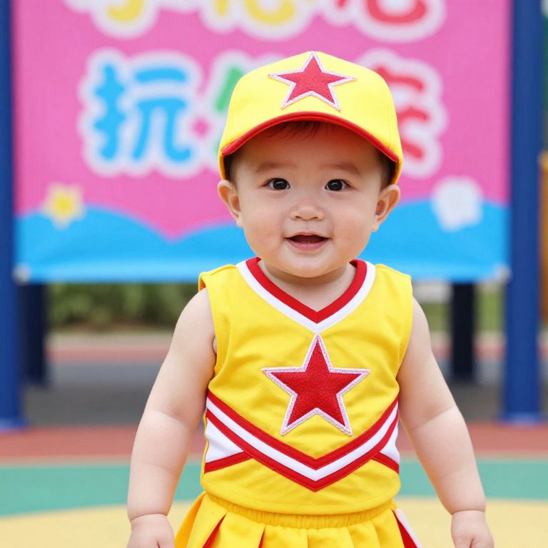 A sweet infant in a bright yellow and red cheerleader outfit, wearing a large cheerleader hat with stars and stripes, standing on a colorful playground with a pink and blue banner in the background, smiling with big, round eyes and a cheerful expression, realistic photography style