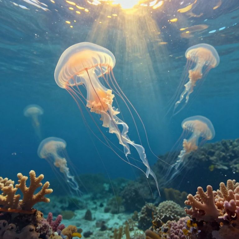 Visualize an underwater impressionist scene from a distinctive viewpoint beneath a vibrant coral reef, as soft, hazy brushstrokes depict the enchanting ballet between a cluster of translucent jellyfish gliding gracefully through an illuminated azure abyss. As sunlight filters through the water, creating a mesmerizing interplay of dappled golden rays upon their delicate tentacles and shimmering bodies, evoke a mood that transitions from serene to captivating, skillfully blending tranquil harmony with alluring mystery.