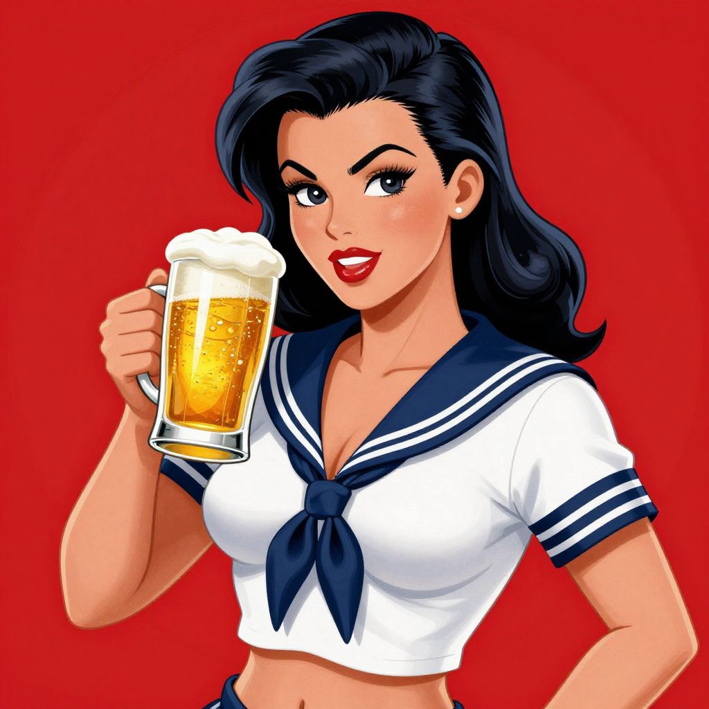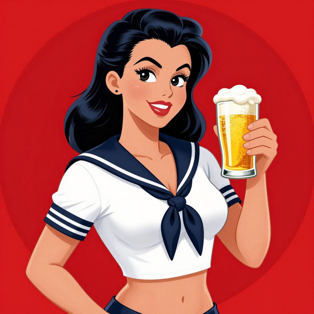 Sailor-themed pin-up illustration featuring a woman in a white sailor outfit with a navy collar and bow tie, holding a frosty glass of golden beer with a frothy head, set against a vibrant red circular background.