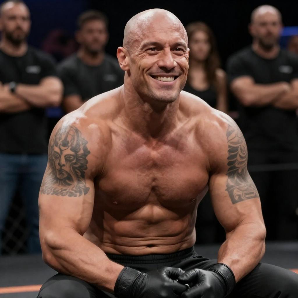 Photograph of a bald, muscular man with a short beard, wearing a light blue button-up shirt and jeans, standing confidently in front of a cityscape engulfed in fire and smoke. Intense expression, city buildings burning in the background.