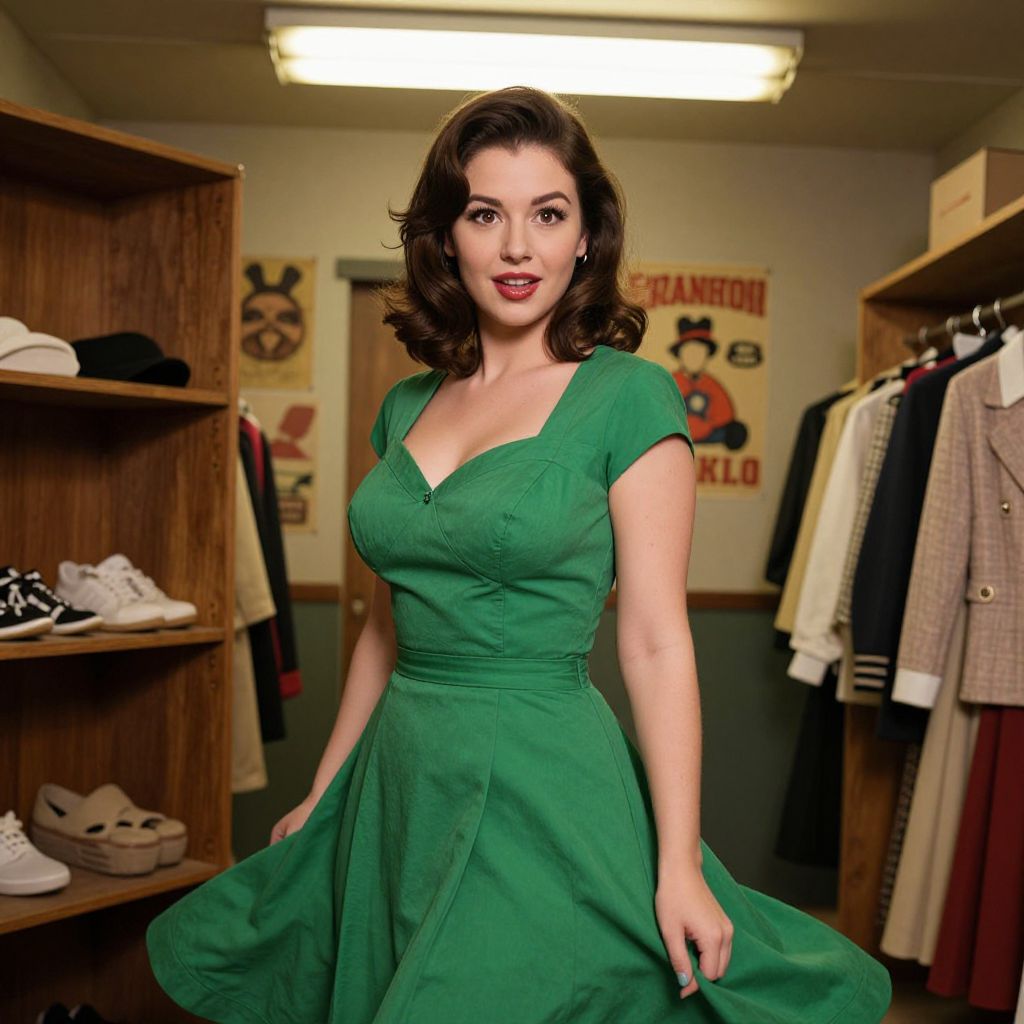 A realistic photography of a woman in her late 20s with soft brown hair and warm brown eyes wearing a vibrant cue green dress, standing in a vintage themed costume room with old wooden shelves, retro posters, and flickering fluorescent lights, her face slightly turned to the camera with a playful expression, the dress slightly flowing as if she's just stepped out of a 1950s comedy movie.. The woman has big tits and cute face