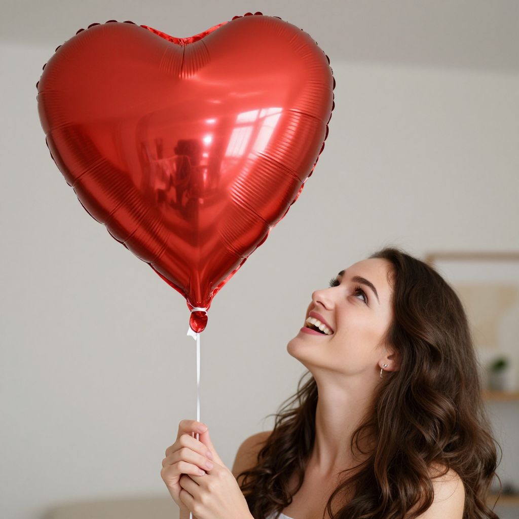 Joyful Woman with Red Heart Balloon