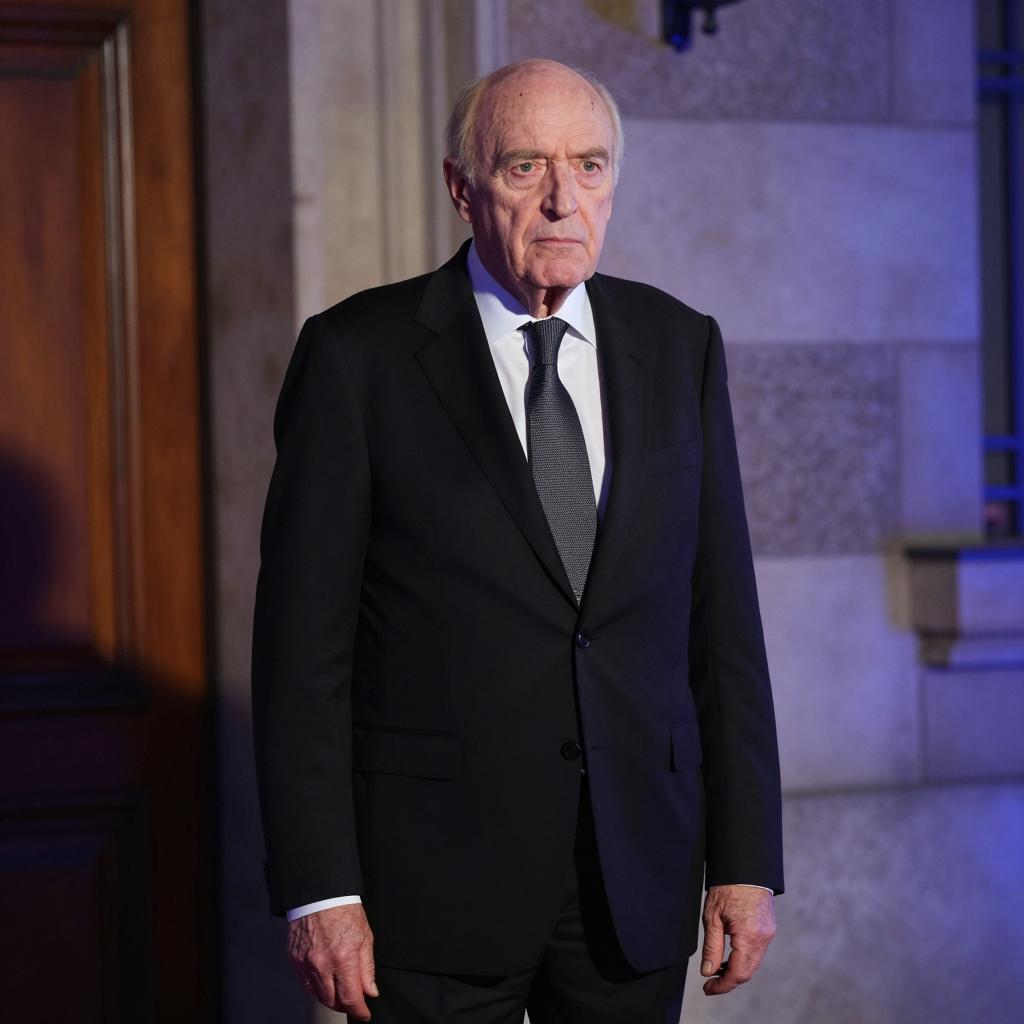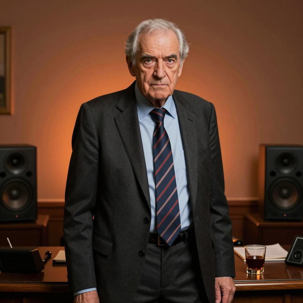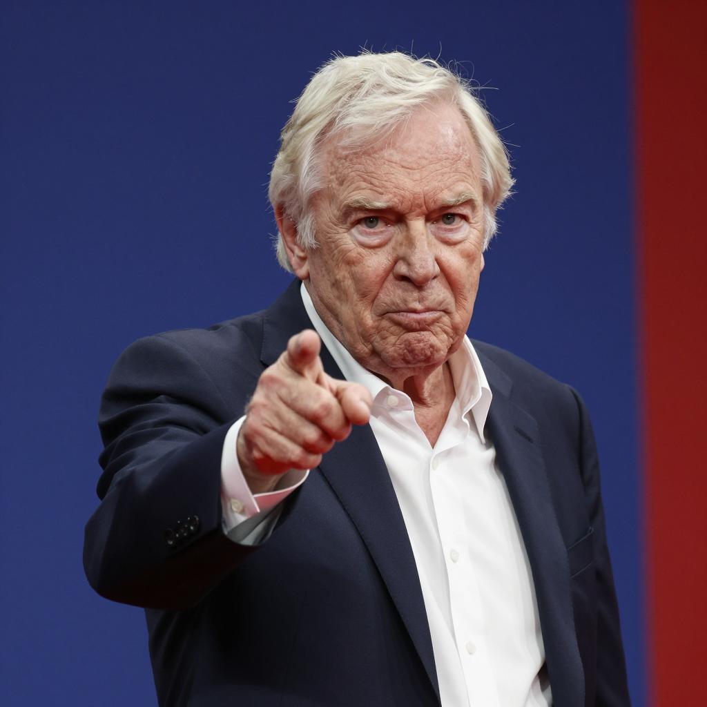 Portrait of an elderly man with blond hair wearing a dark suit and white shirt, pointing directly at the camera with an intense focused expression. The upper body shot features a blue background with a red light on the right side.