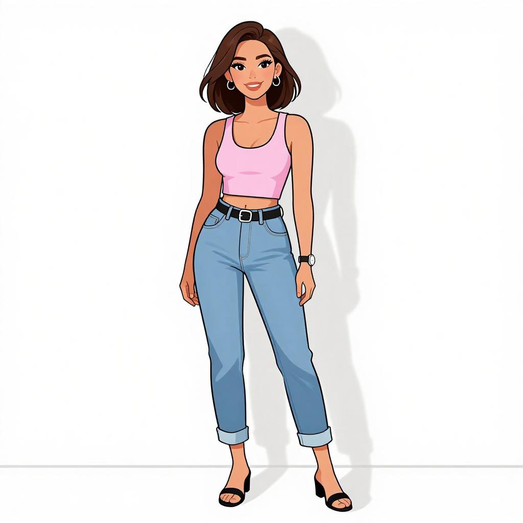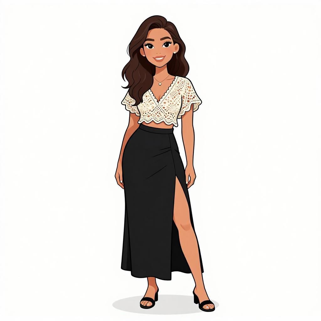 Woman with pretty face and pretty hair. smiling Woman, contemporary street style, black cropped top with short sleeves, high-waisted teal pleated midi skirt, leopard print faux fur coat draped over shoulders, black strappy flat sandals, minimal makeup, casual hairstyle, white studio background --sref 1467