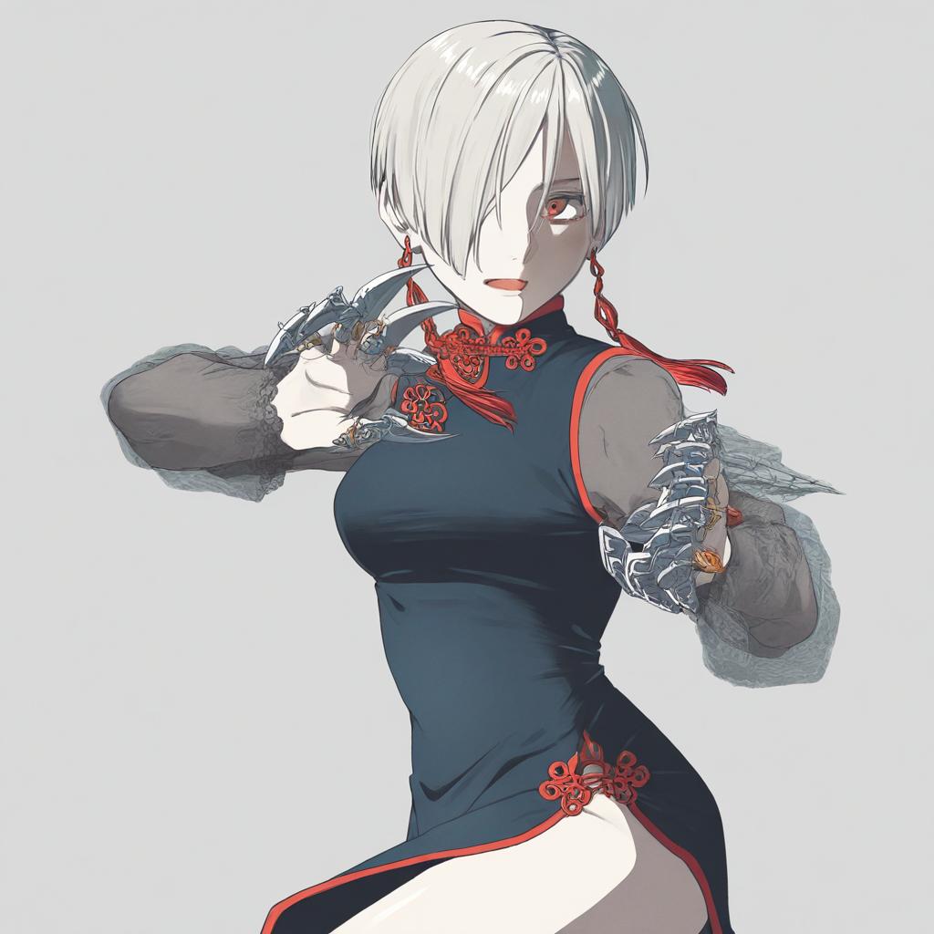 A.k.i. (street fighter), street fighter, 1girl, pale skin, red lips, mole under mouth, red eyes, hair over one eye, short hair, white hair, grey hair, china dress, chinese clothes, tassel earrings, claw (weapon), claw ring, by artist inuno rakugaki, leet