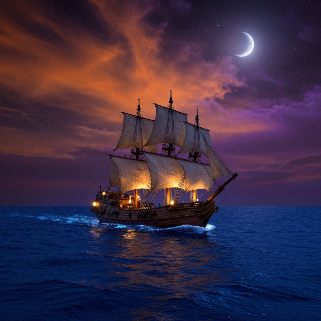 A mystical, moonlit ocean unfurls beneath a swirling, orange-purple sky, as a glowing, ethereal ship slices through the bioluminescent waters, leaving a sparkling, iridescent trail in its wake, The crescent moon casts an argent glow, illuminating the waves, where delicate, jellyfish-like creatures undulate, their translucent bodies aglow with soft, blue-green light, Towering, crystalline spires rise from the depths, their facets glinting like a thousand tiny stars, as schools of rainbow-hued fish dart and weave through the shimmering, cosmic-hued waters, The air is alive with the sweet, heady scent of blooming, star-petaled flowers, which drift, like celestial messengers, on the gentle, lunar breeze, as the ship's hull shimmers, imbued with an otherworldly, magic aura, its sails billowing with an soft, ethereal light