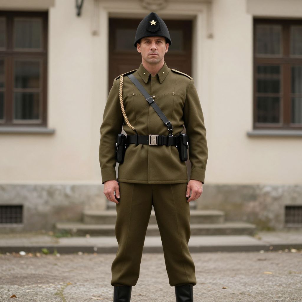 Photograph of a stern-faced male soldier in a WWII-style olive-green uniform, black helmet with star, standing in front of a beige building with dark