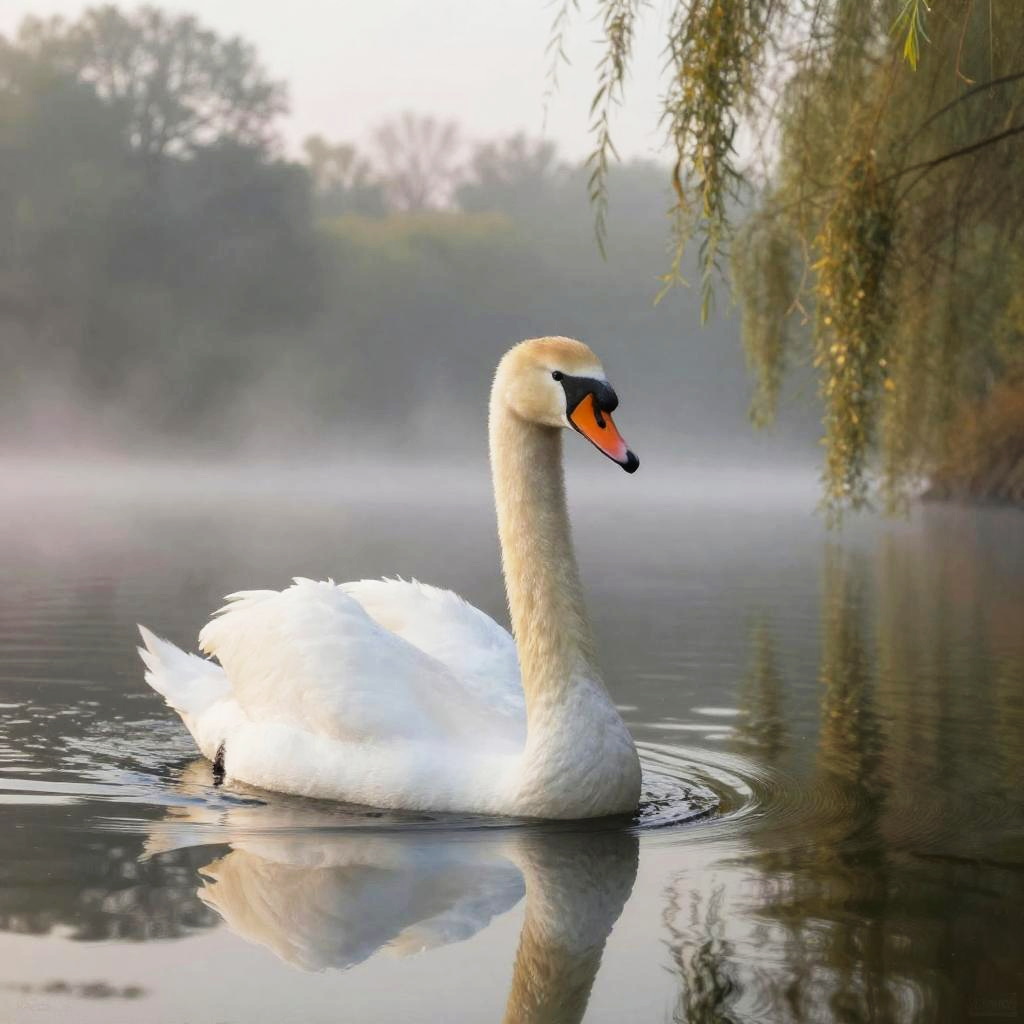 Graceful swan gliding over mirrored lake on calm misty lake surrounded by willows at dawn, in soft pastel impressionistic painting; heroic stance, warm rim light, detailed textures and fine fur/skin, expressive eyes, atmospheric perspective, low-angle dramatic view, leading lines, balanced rule-of-thirds composition, soft background separation, high dynamic range feel, ultra sharp subject, natural color grade, subtle haze, microcontrast on edges, immersive realism, SDXL, 8k resolution