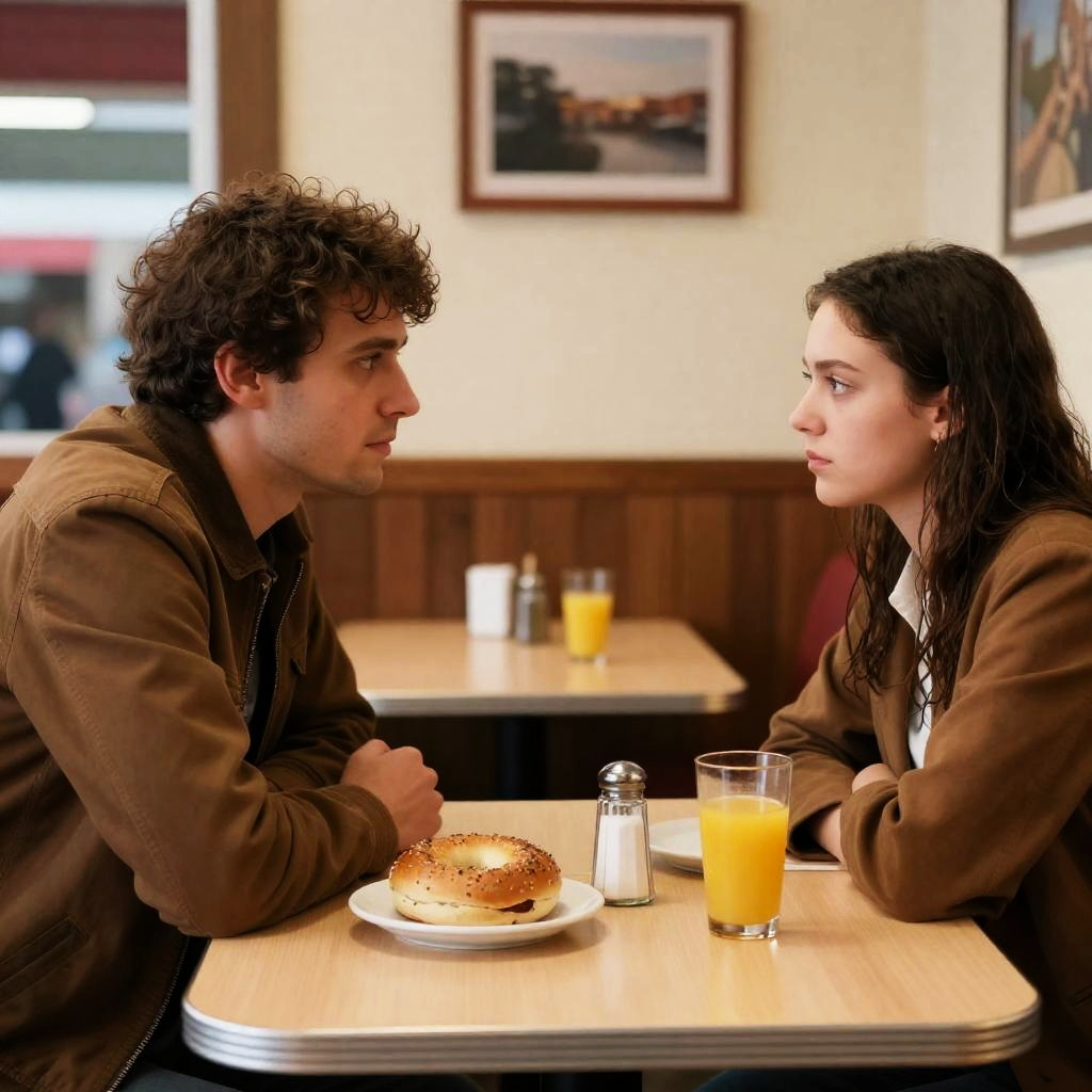 Photograph of a man and woman in a retro diner booth. Man with dark hair, black sweater, gesturing with his hands. Woman with light brown hair, teal sweater, smiling. White table with coffee, salt and pepper shakers, and food. Red booth seats, yellow and white patterned curtain in background. Both seated facing each other, engaged in conversation.