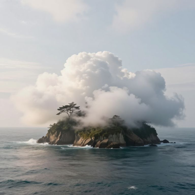 An ethereal island cradles its dreams in fluffy forms, where the quiet whispers of solitude intertwine with the gentle lull of the ocean, evoking a surreal dance between imagination and reality.