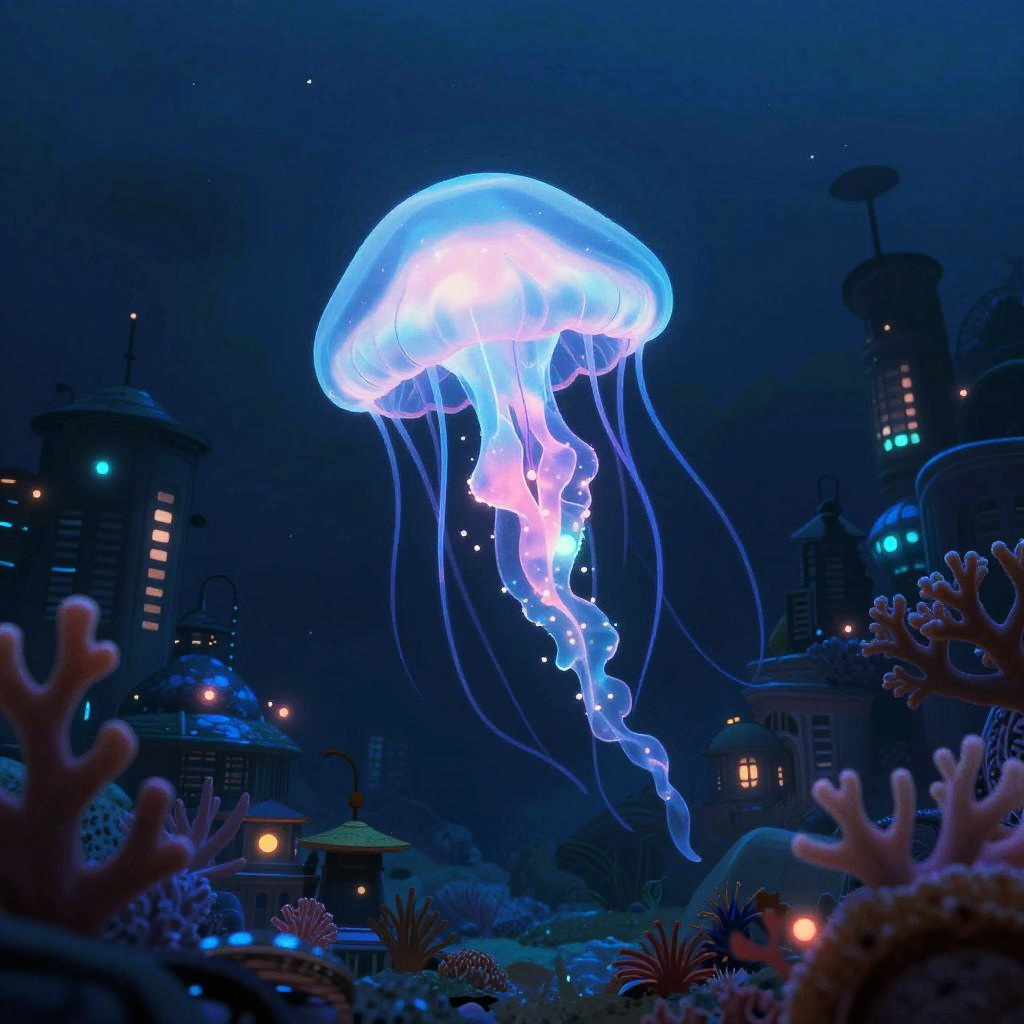 Anime art style a bioluminescent jellyfish witch in a deep sea trench city surrounded by glowing coral reefs