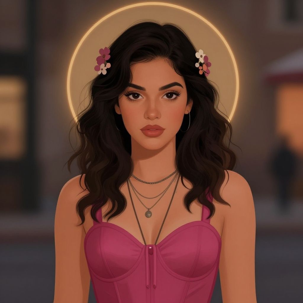 A striking digital portrait of a young woman with dark, wavy hair adorned with floral hairpins, wearing a deep pink corset-style top and layered necklaces. The artwork blends realistic features with an illustrative style, capturing a moody urban background illuminated by soft, warm lighting and a halo-like circle behind her head.