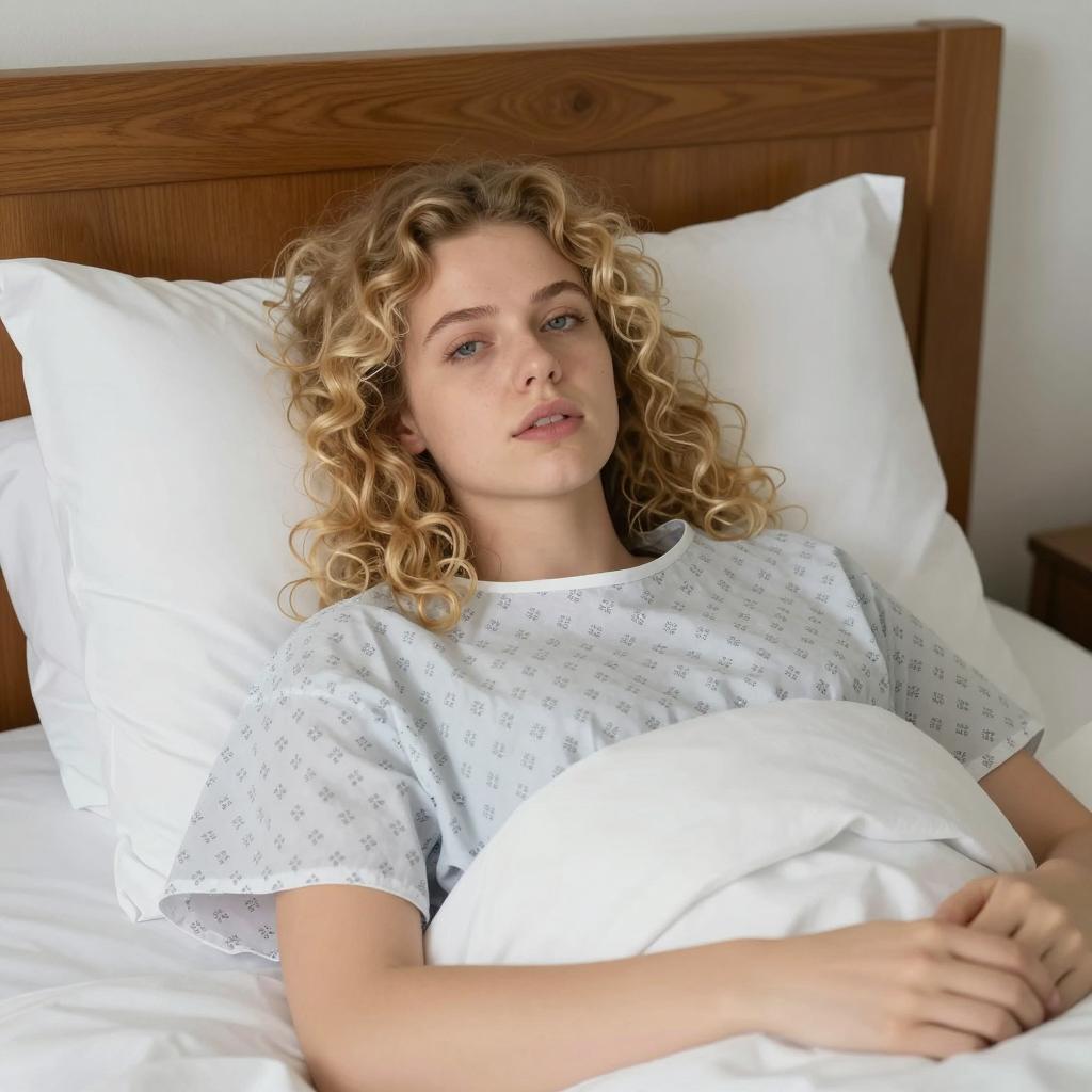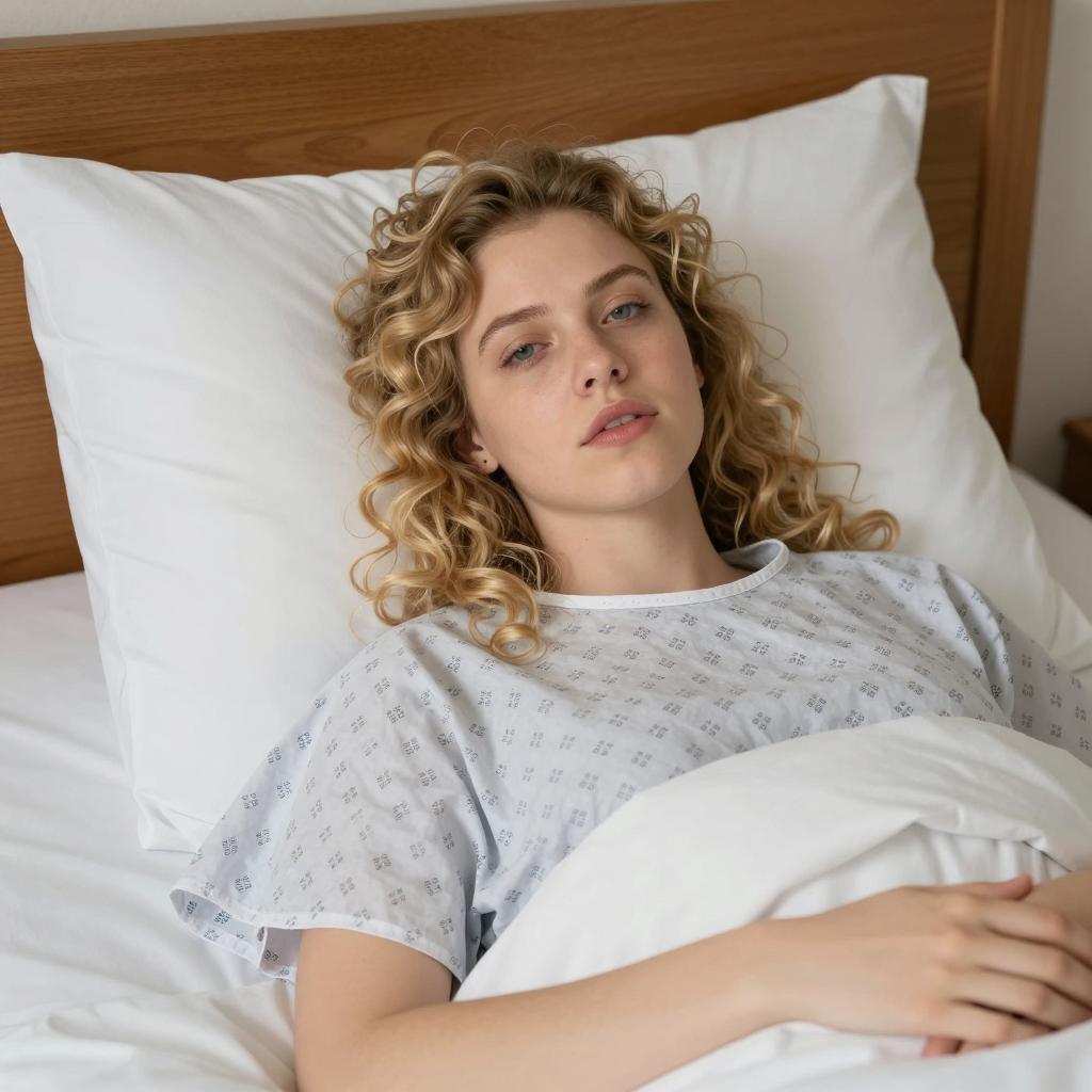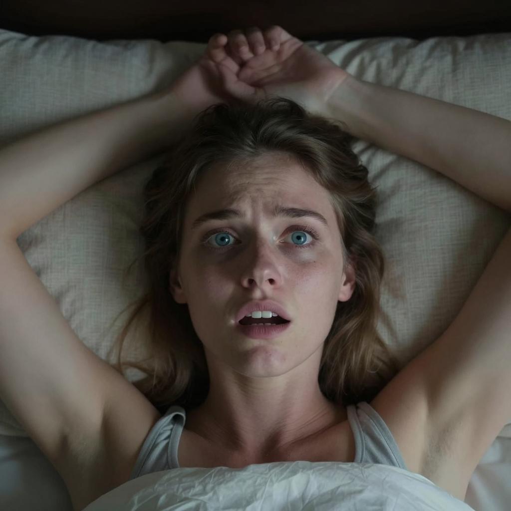A frightened woman with light brown hair lying on a patterned pillow. She has her arms above her head, blue eyes wide, and mouth slightly open showing teeth. Dimly lit, dark background.