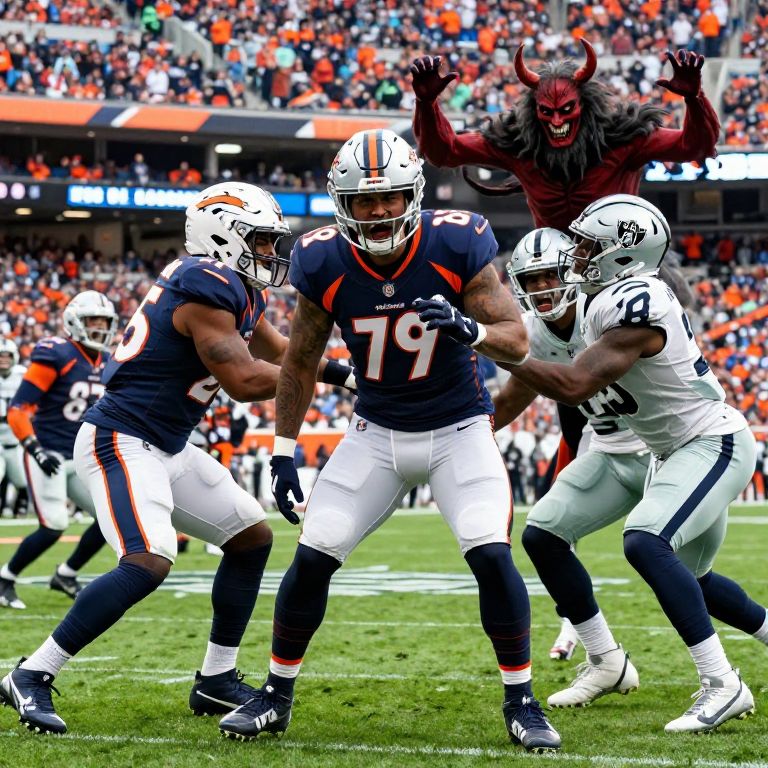 Horizon a hype real photo of Denver Broncos football players as demons, terrorizing the Oakland Raiders,