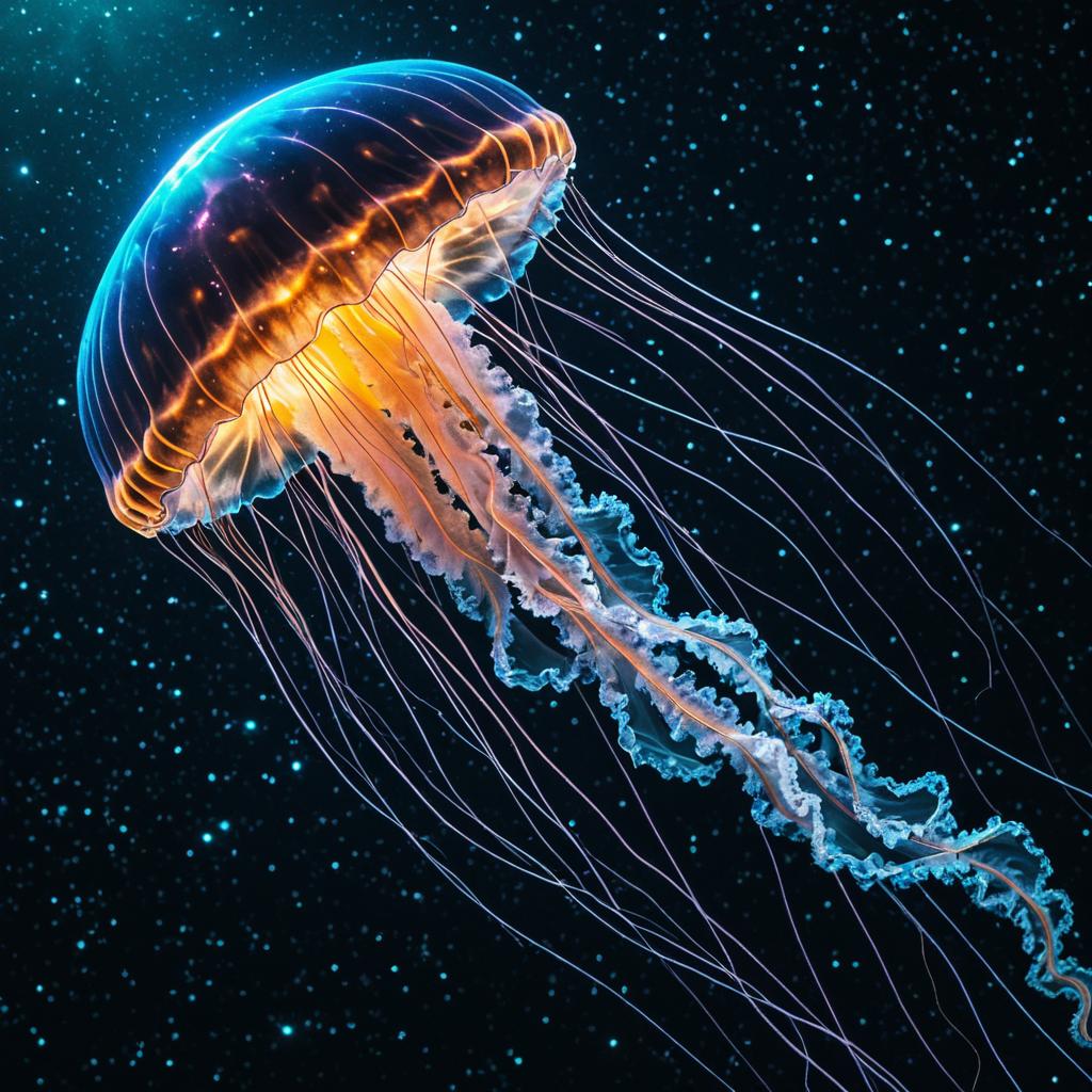 A highly detailed and luminous jellyfish gracefully floating in the deep ocean. The jellyfish features a glowing, translucent bell with vibrant orange and blue hues, accompanied by intricate tentacles emitting a soft light. The dark background is dotted with small light particles, enhancing the surreal and exquisite appearance of the underwater creature.
