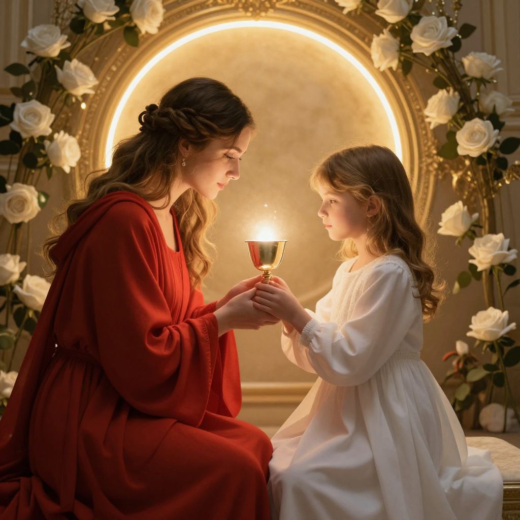 Radiant golden light illuminates a tender moment as a woman in a flowing red robe and a child in a pristine white gown share a sacred communion, their hands gently cradling a glowing chalice, framed by a halo and surrounded by delicate white roses.