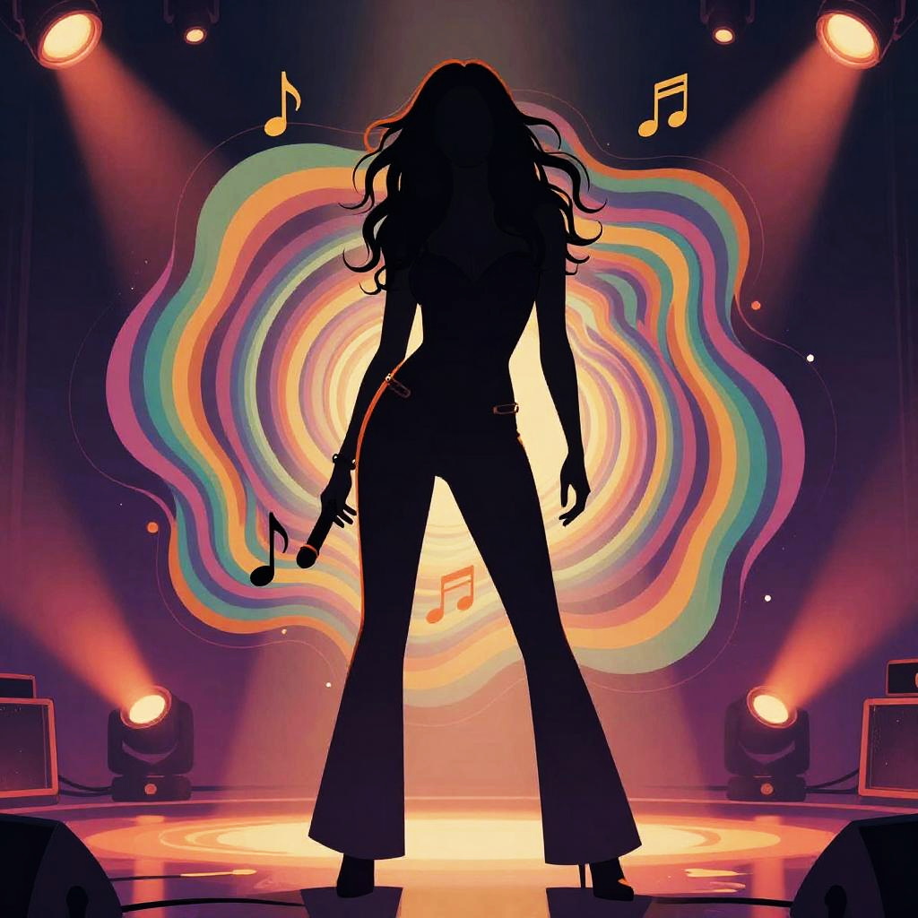 Grace Slick height visualization, conceptual art showing the silhouette of a tall female rocker amidst swirling psychedelic colors, musical notes subtly integrated, vintage rock and roll aesthetic, 60s fashion and stage lighting effects, dynamic and artistic composition