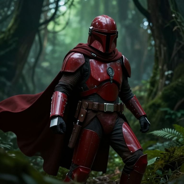 Mandalorian red armor warrior in a dense alien forest, armor reflecting green foliage and soft light, stealthy pose with a cloaked cape fluttering, sci-fi fantasy style, high detail with realistic textures, ambient light filtering through trees creating moody atmosphere.