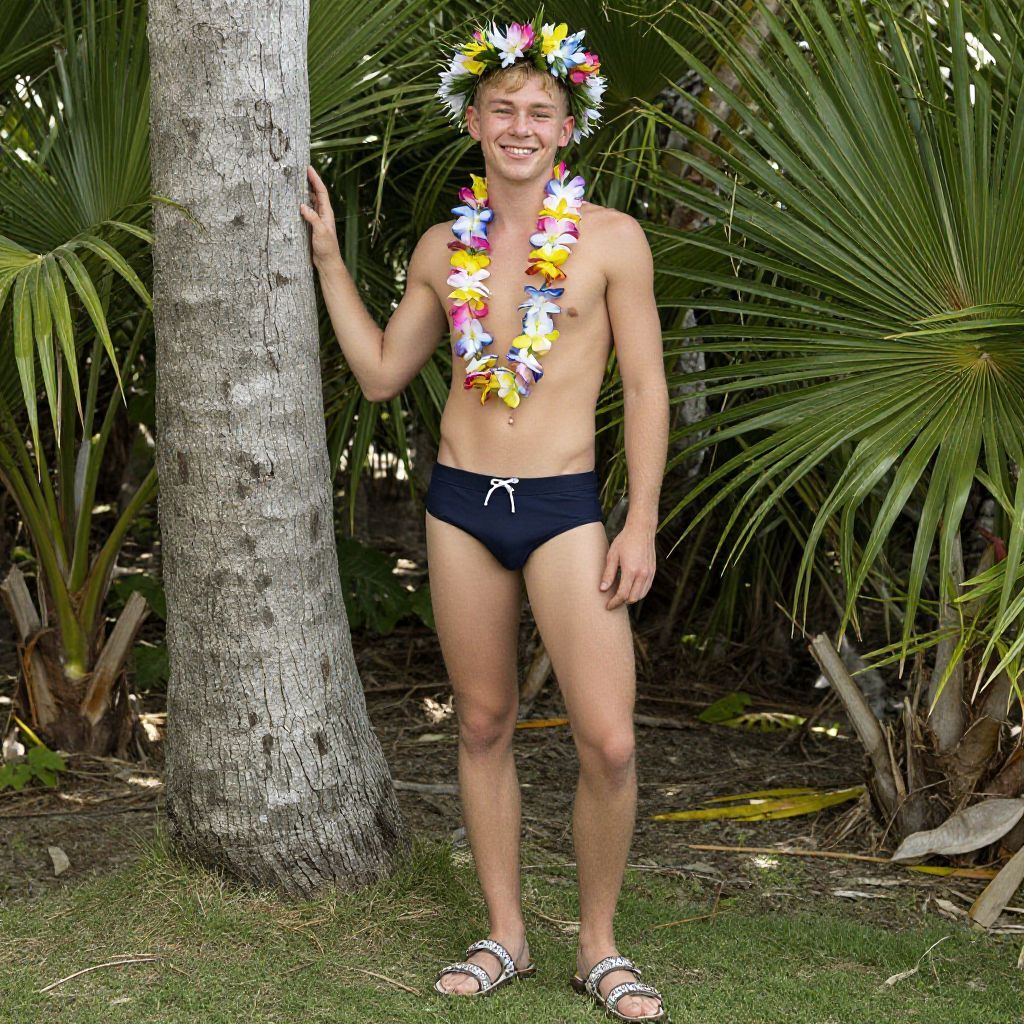 "luau attire costume, 1boy, male focus, flower necklace, solo, topless male, outdoors, sandals, blonde hair, full body, head wreath, smile, palm tree, necklace, male swimwear, navel, tree Realistic photo of casual sexy person with pretty face"