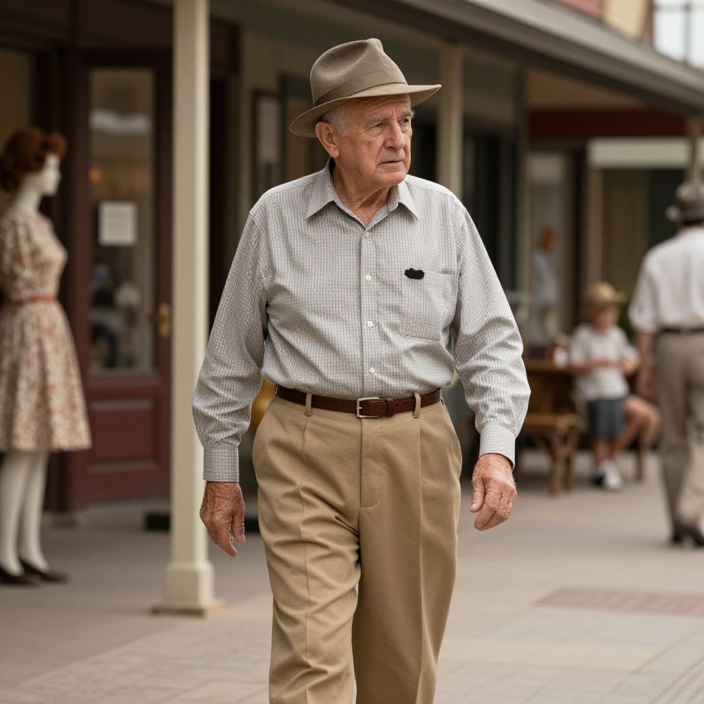 A realistic image of an elderly man in a classic American costume, wearing a button-down shirt, khaki pants, and a fedora hat, walking slowly through a vintage 1950s-style shopping district, detailed textures, warm color palette, nostalgic Americana vibe