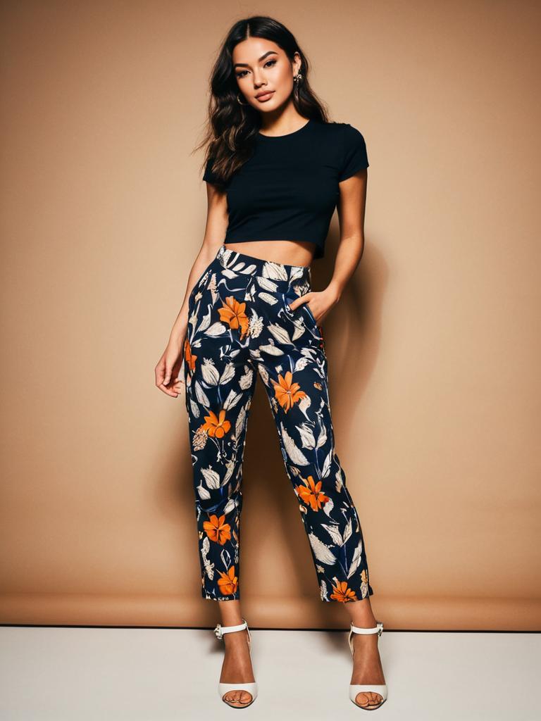 Studio portrait of a young woman wearing mustard yellow bib overalls over a white short-sleeve T-shirt. She is styled with black ankle boots with a slight heel and her hair is loose with soft waves. The background is a plain white studio setting with soft lighting.