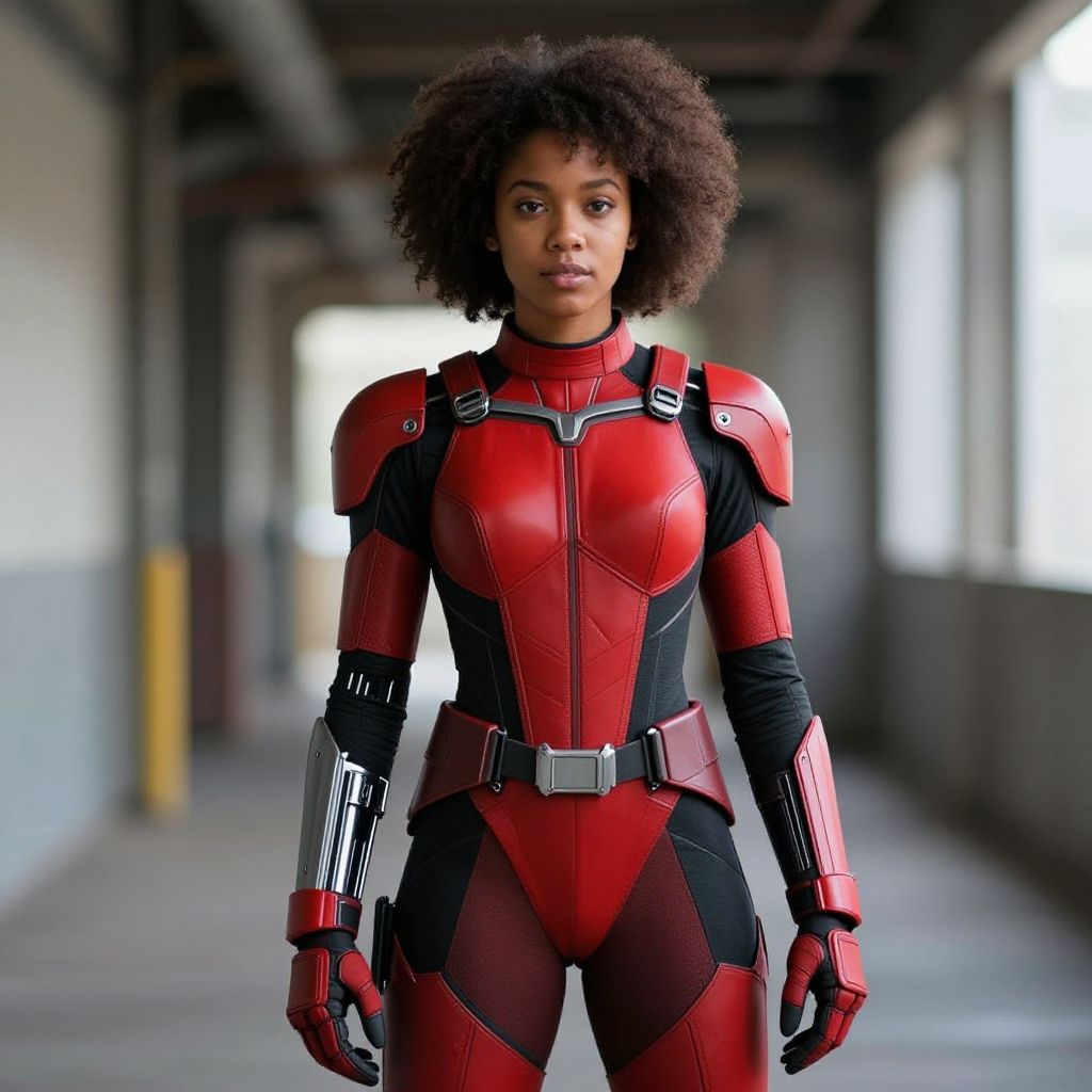 Confident young African American woman wearing a form-fitting red and black futuristic armor costume with partial cybernetic arm, standing in an industrial corridor. The costume features sleek, armored shoulder pads, gauntlets, and a metallic belt, complemented by her natural afro hairstyle.