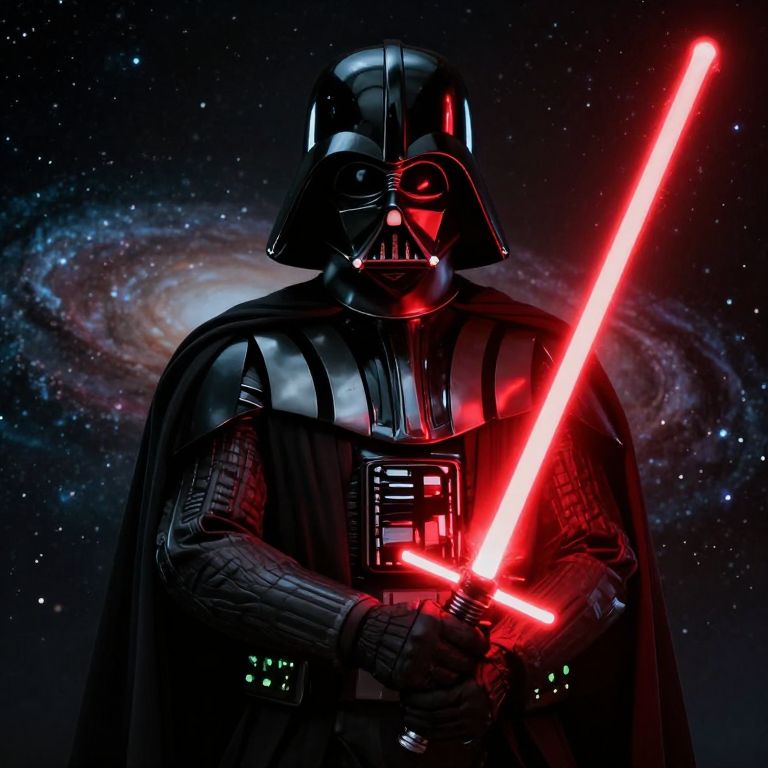A digital illustration depicts Darth Vader, a towering figure in a black, metallic helmet and chest plate, holding a glowing red lightsaber. He stands against a starry, cosmic background with a nebula. His armor is detailed with buttons and panels, and he wears a black cape. The red lightsaber emits bright light, contrasting with the dark, reflective surfaces of his armor. The image combines realism with a sci-fi aesthetic, highlighting Vader's intimidating presence in a space-themed setting.