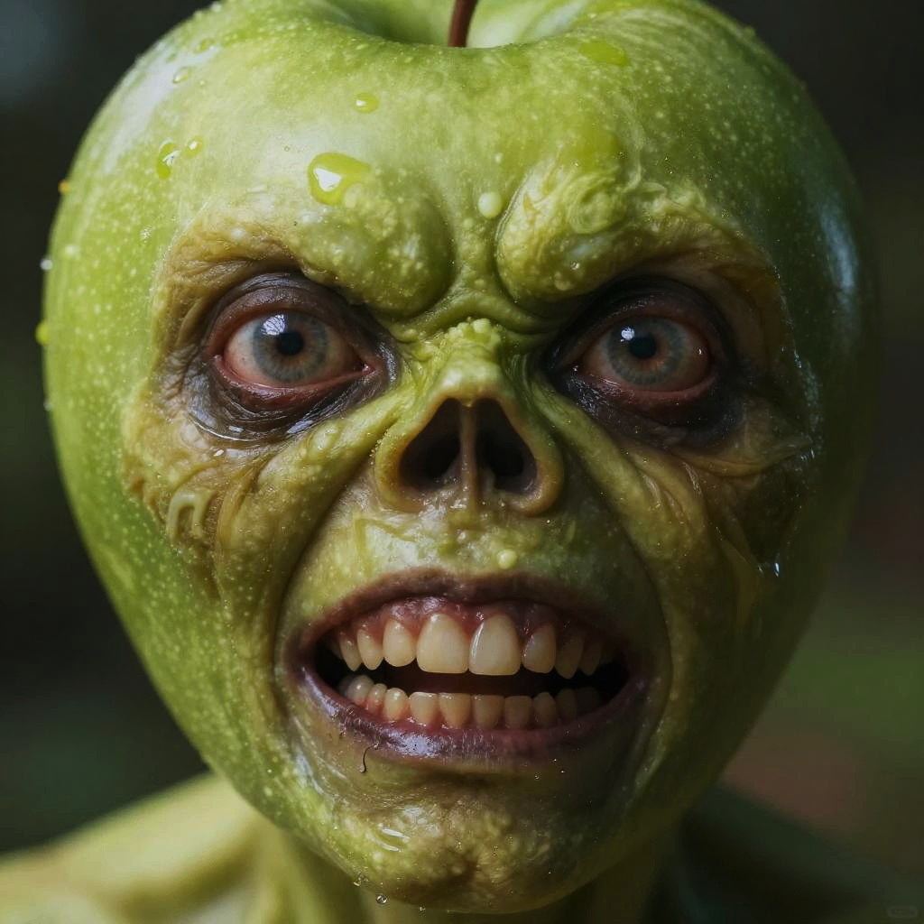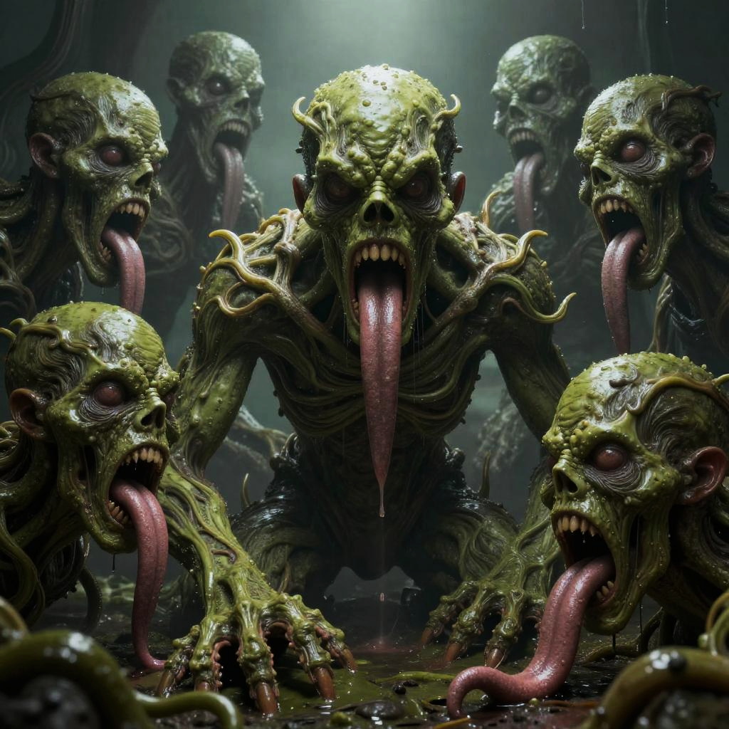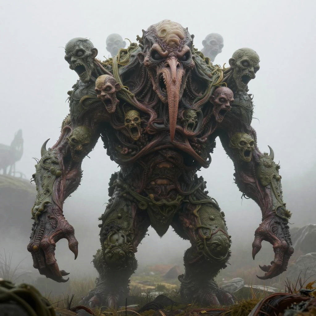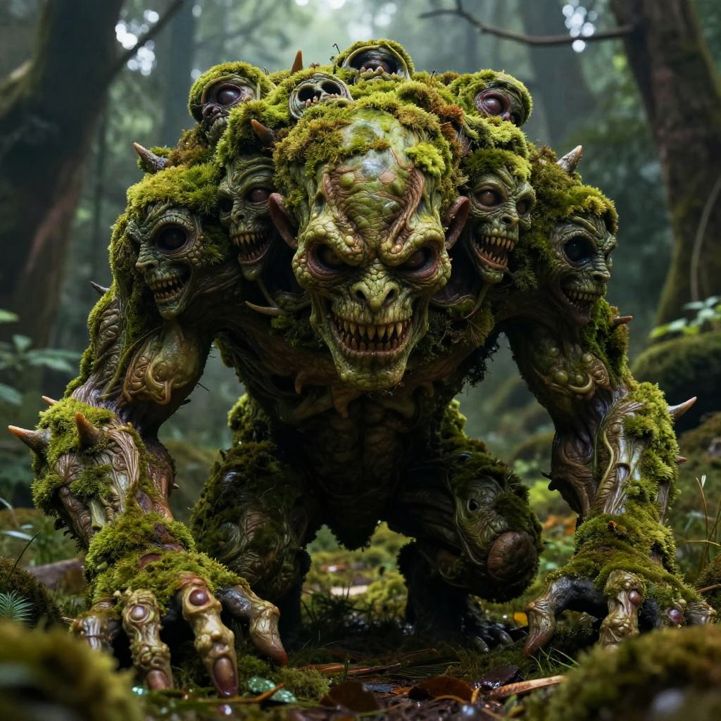 Huge moss green gigantic mutant humanoid with contorted faces growing in clusters, fused noses, leering grins, surreal and grotesque design, eerie atmosphere, unsettling visual