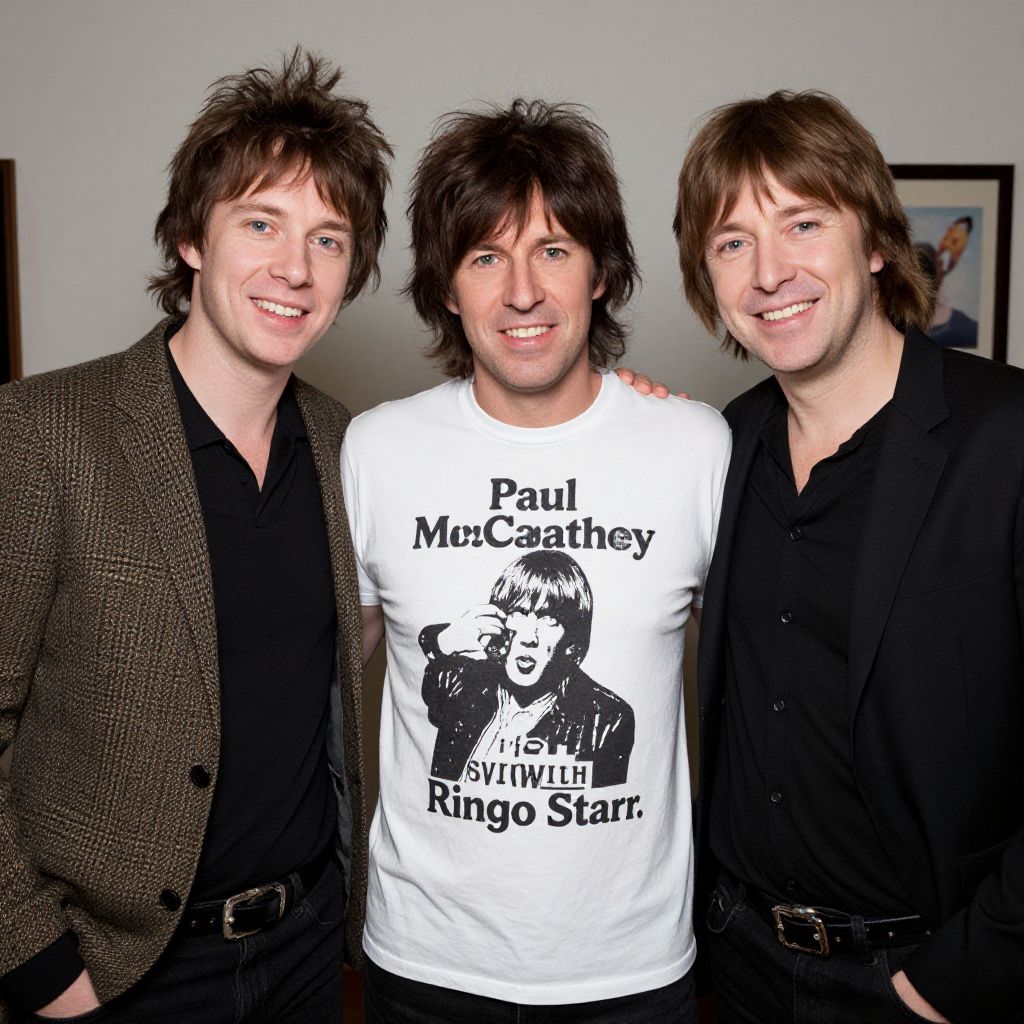 Three individuals—two men and one woman—pose together in a casual indoor setting, with the central figure wearing a graphic T-shirt that reads \"Paul McCartney slept with Ringo Starr,\" flanked by two smiling men dressed in stylish jackets.